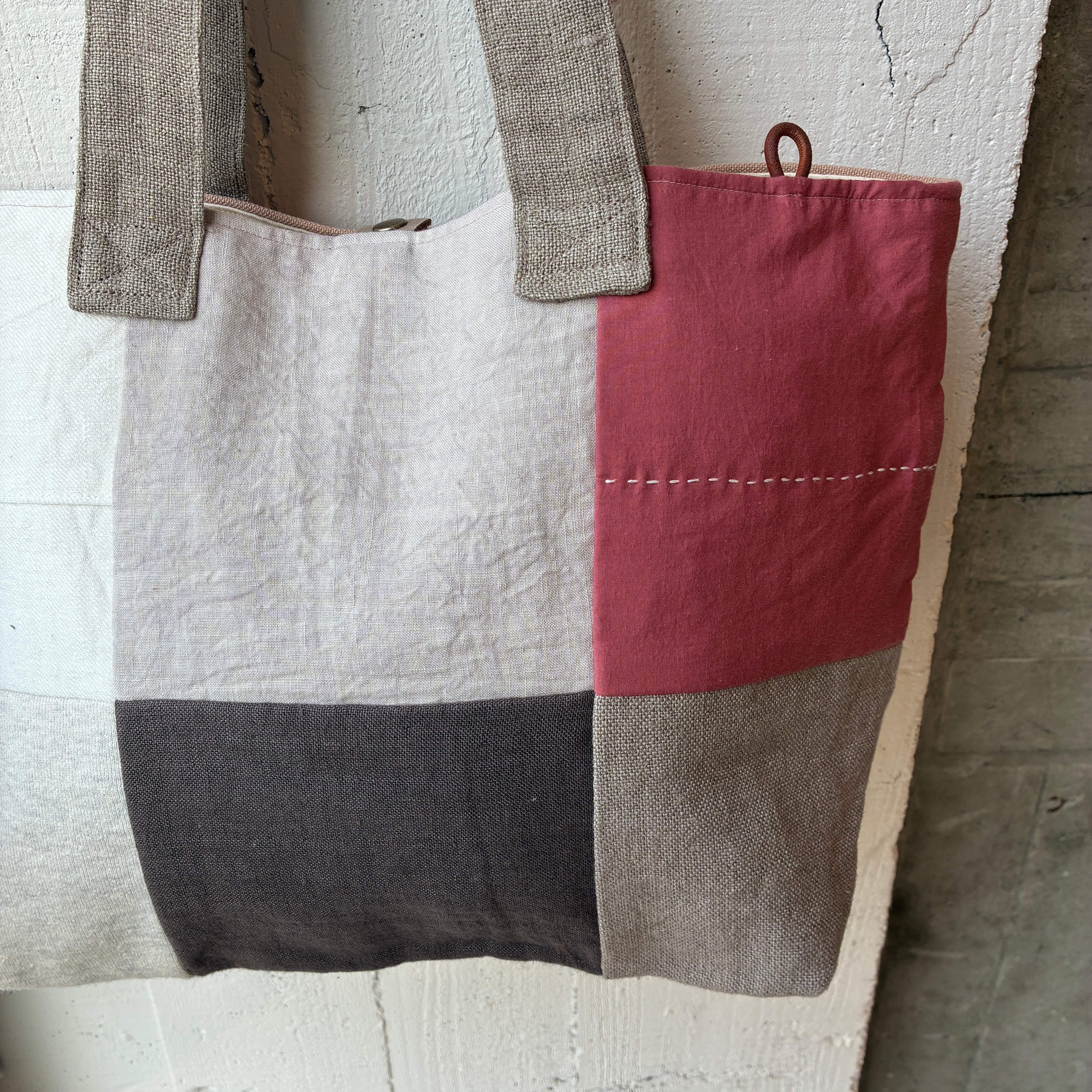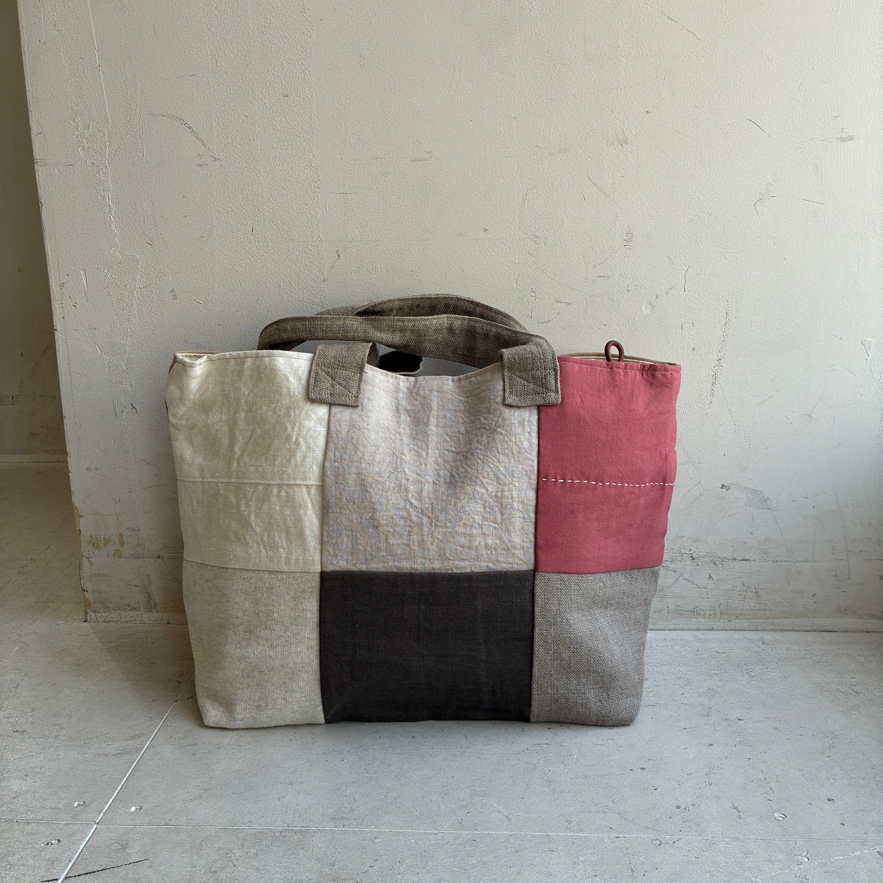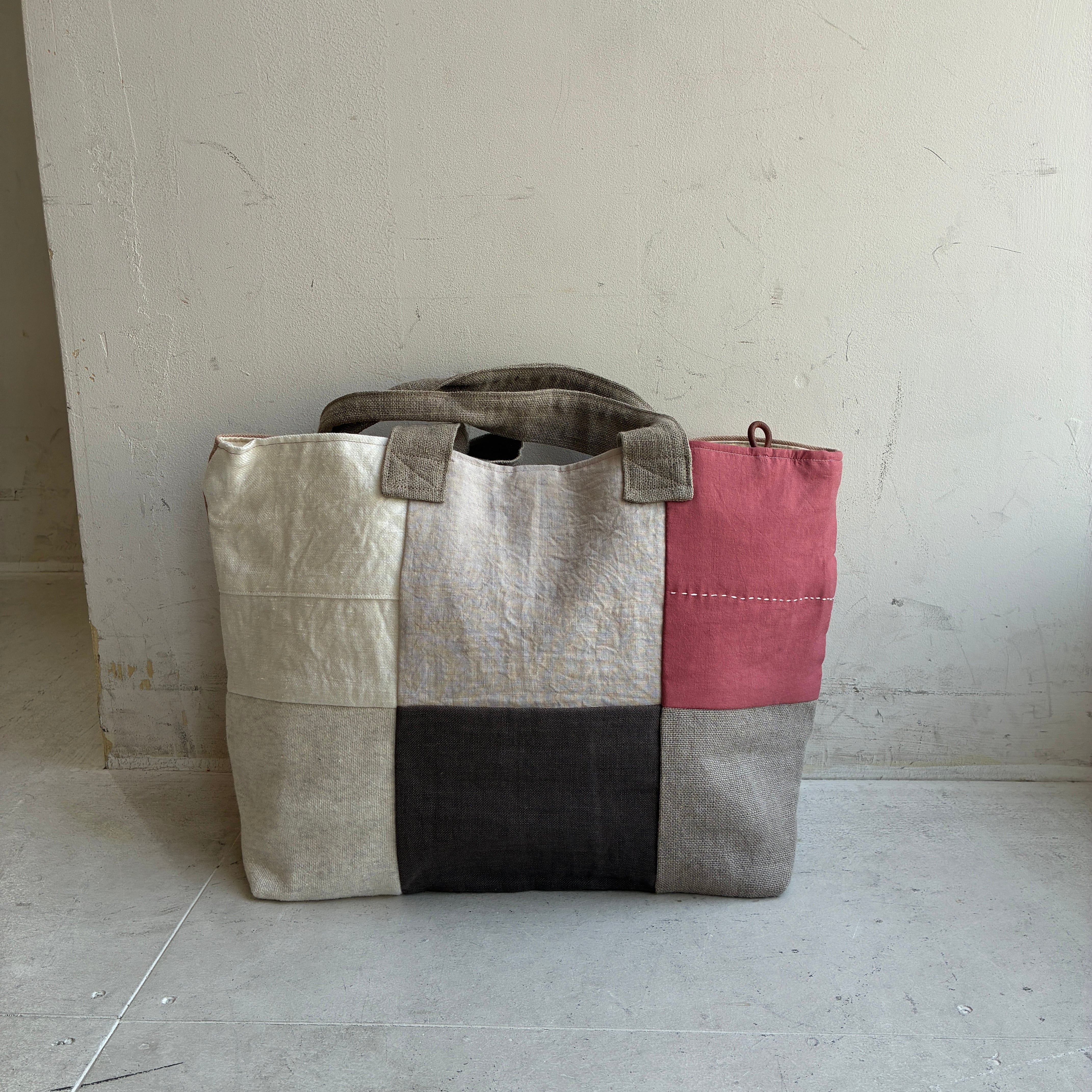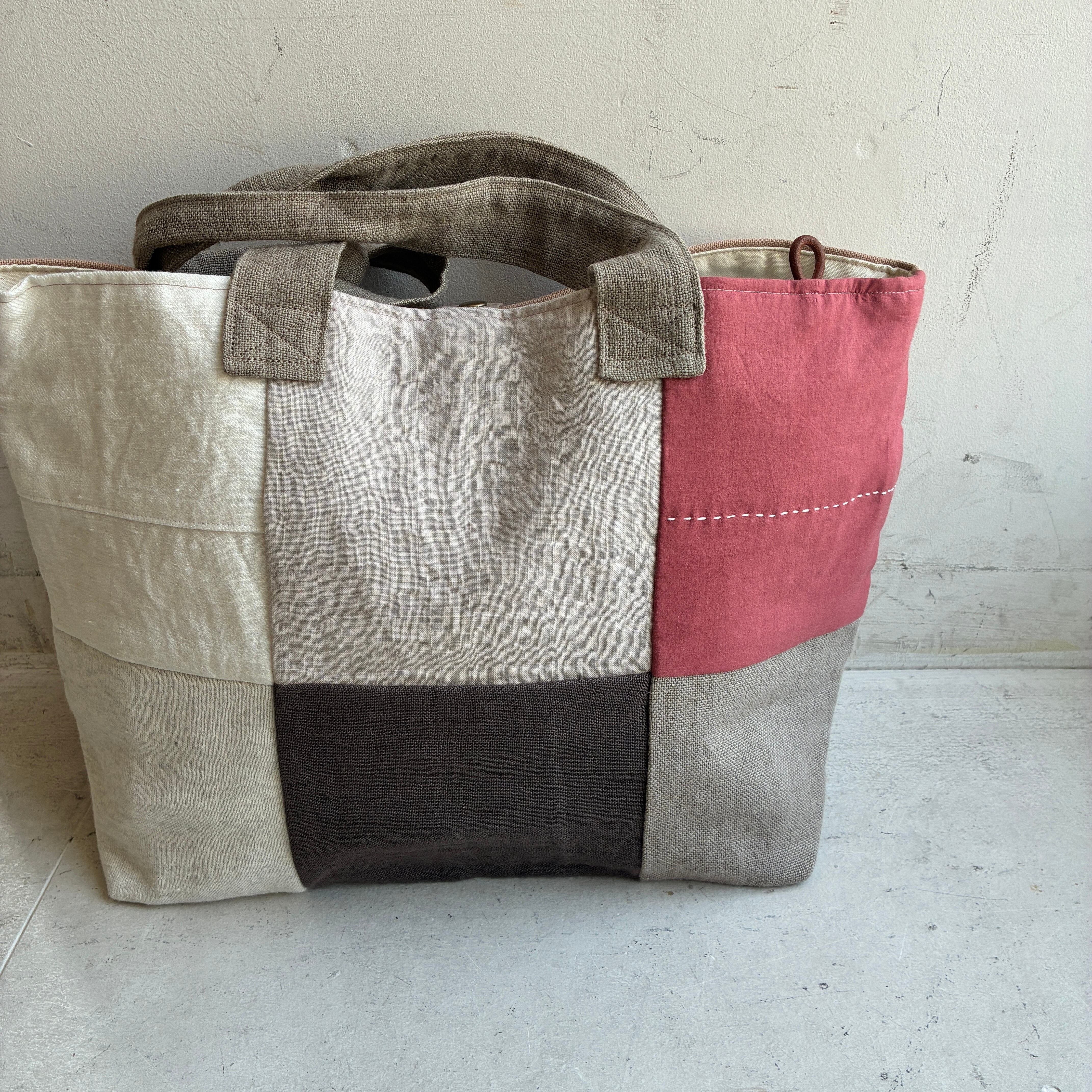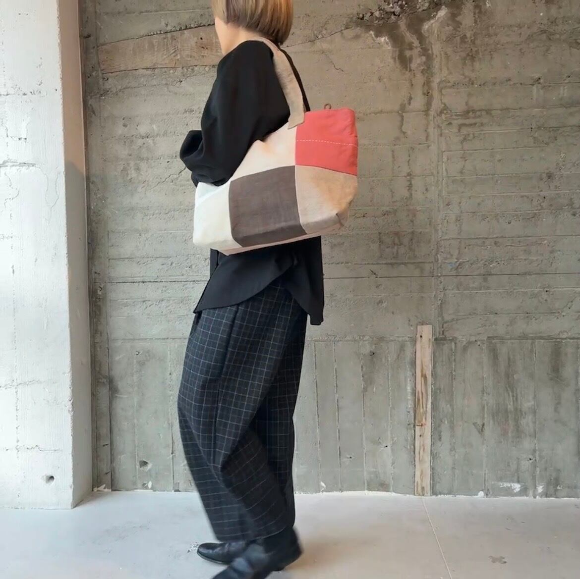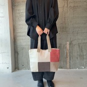 前面にはリネンやコットンを使った異素材のパッチワークを施し、後ろ側はしっかりとした帆布でまとめています。軽やかさと丈夫さを兼ね備えたデザインは、普段使いにぴったり。