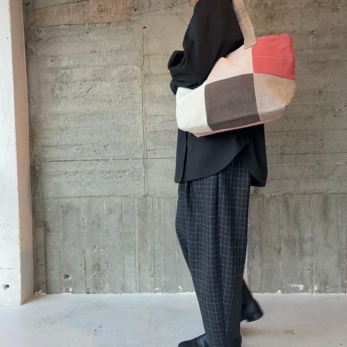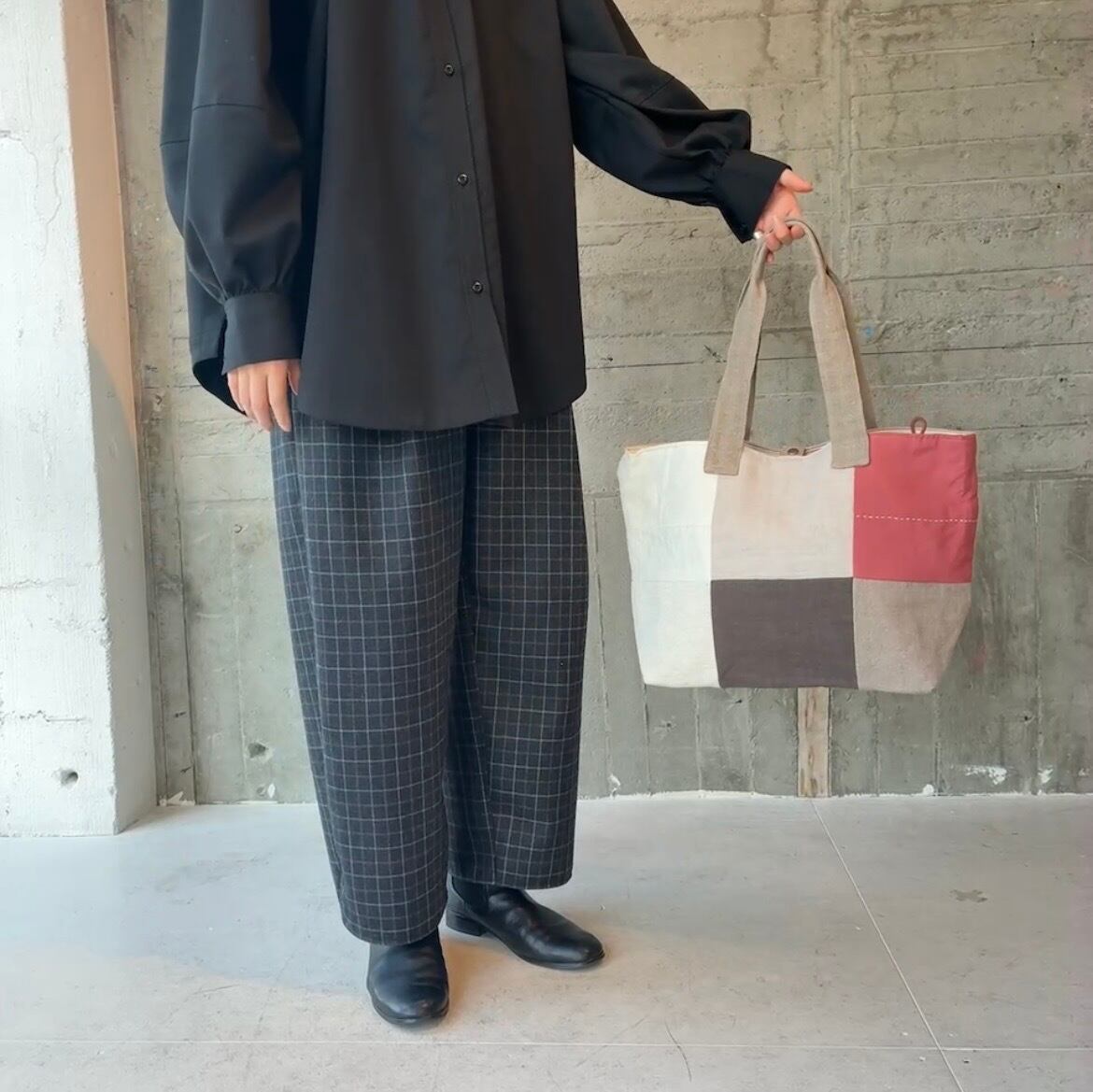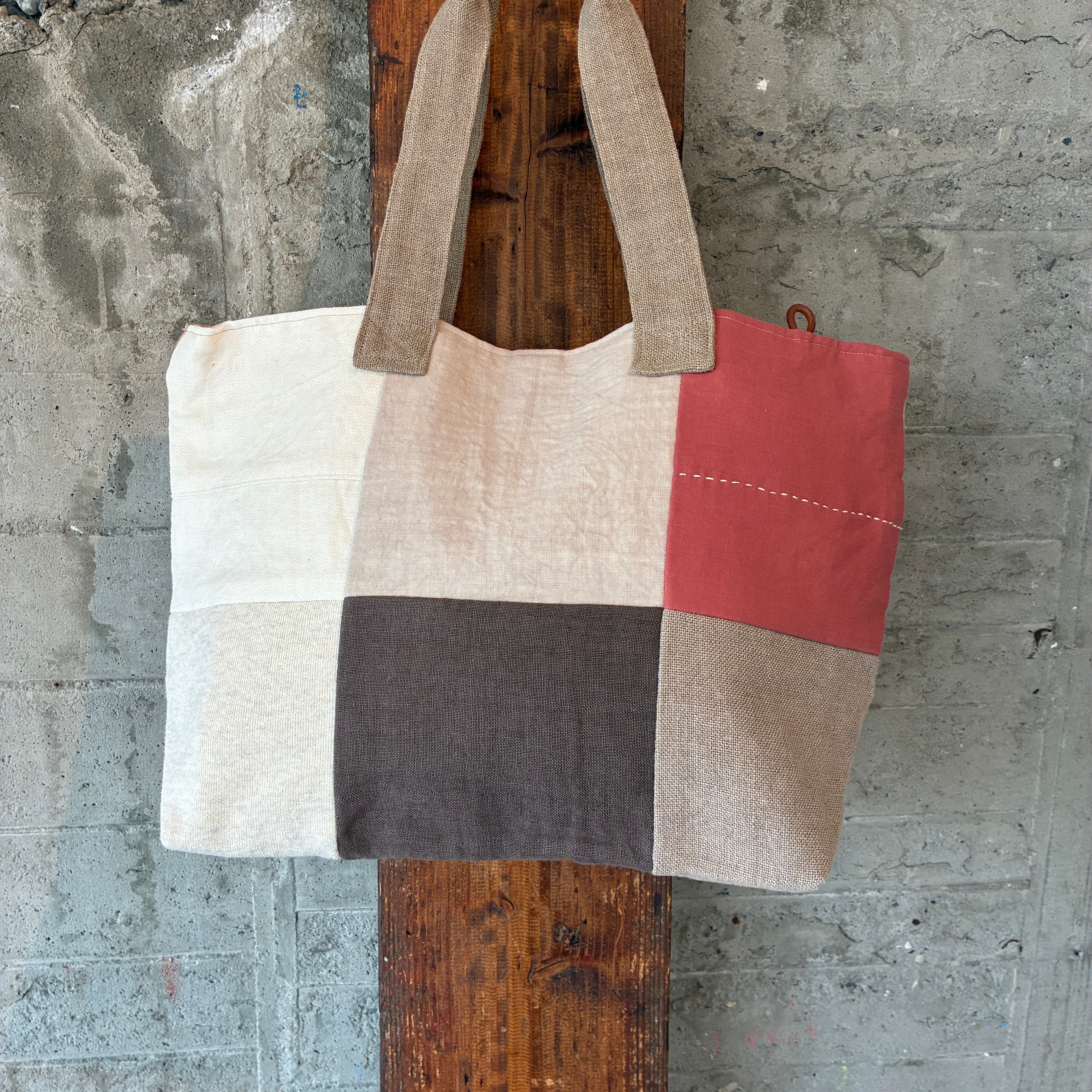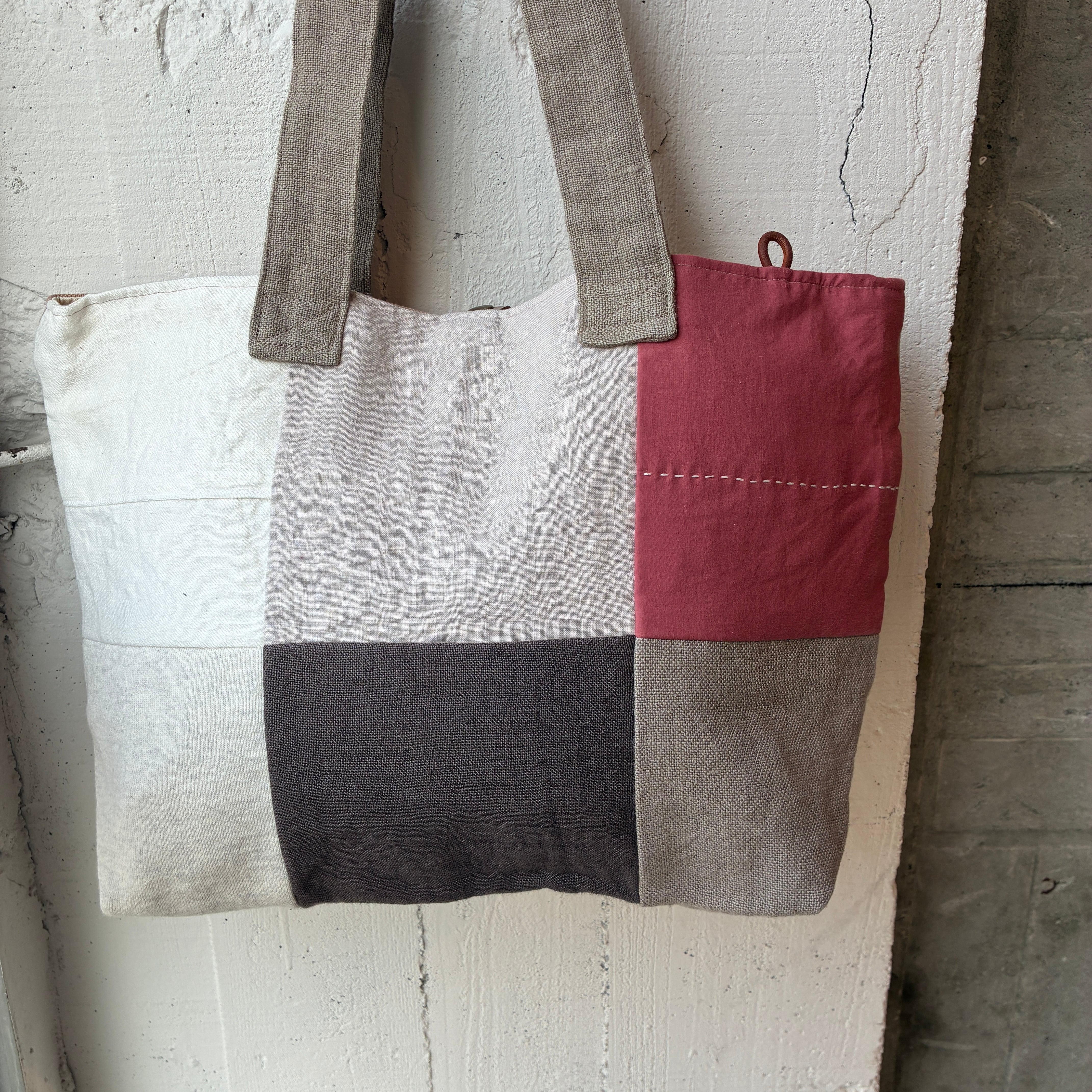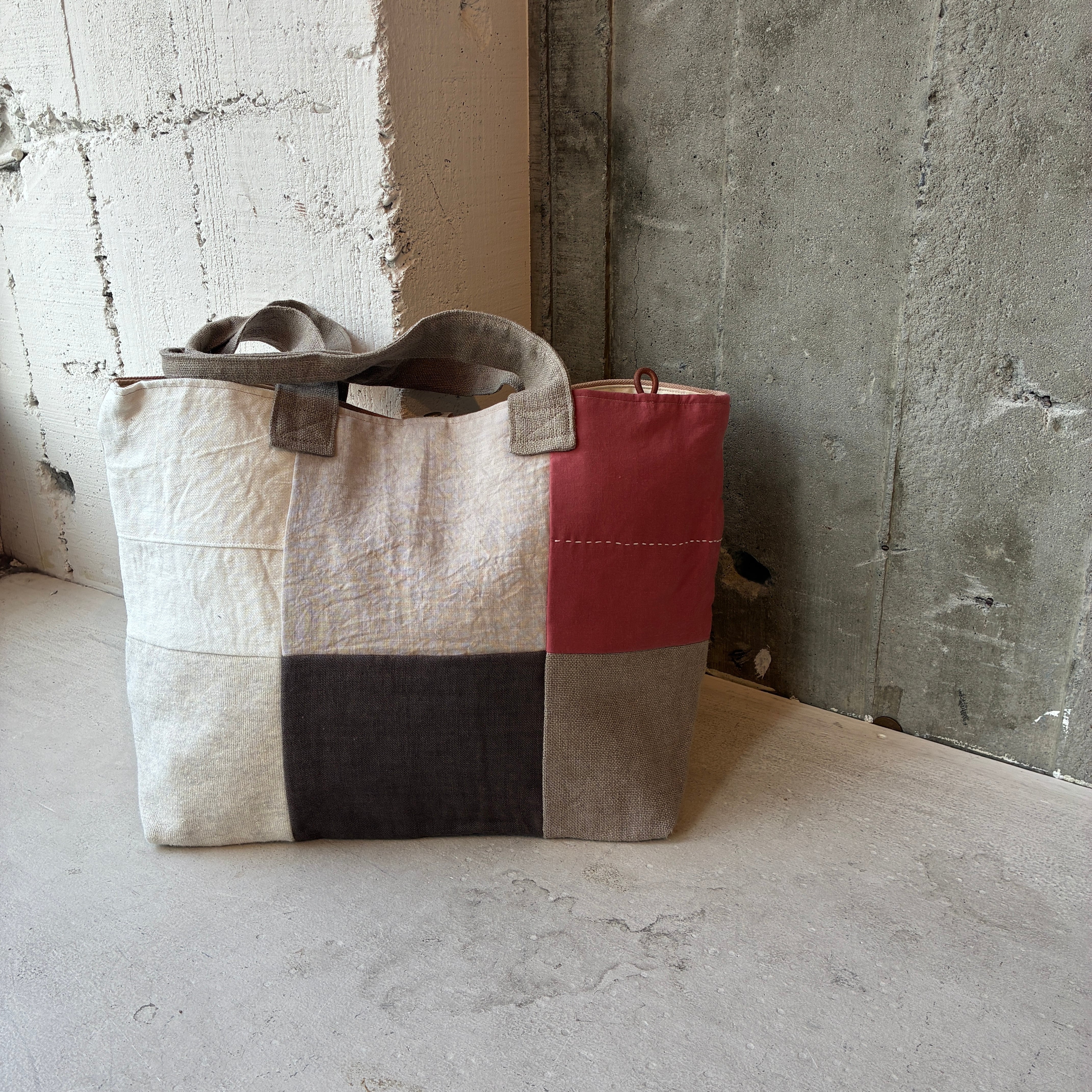 前面にはリネンやコットンを使った異素材のパッチワークを施し、後ろ側はしっかりとした帆布でまとめています。軽やかさと丈夫さを兼ね備えたデザインは、普段使いにぴったり。