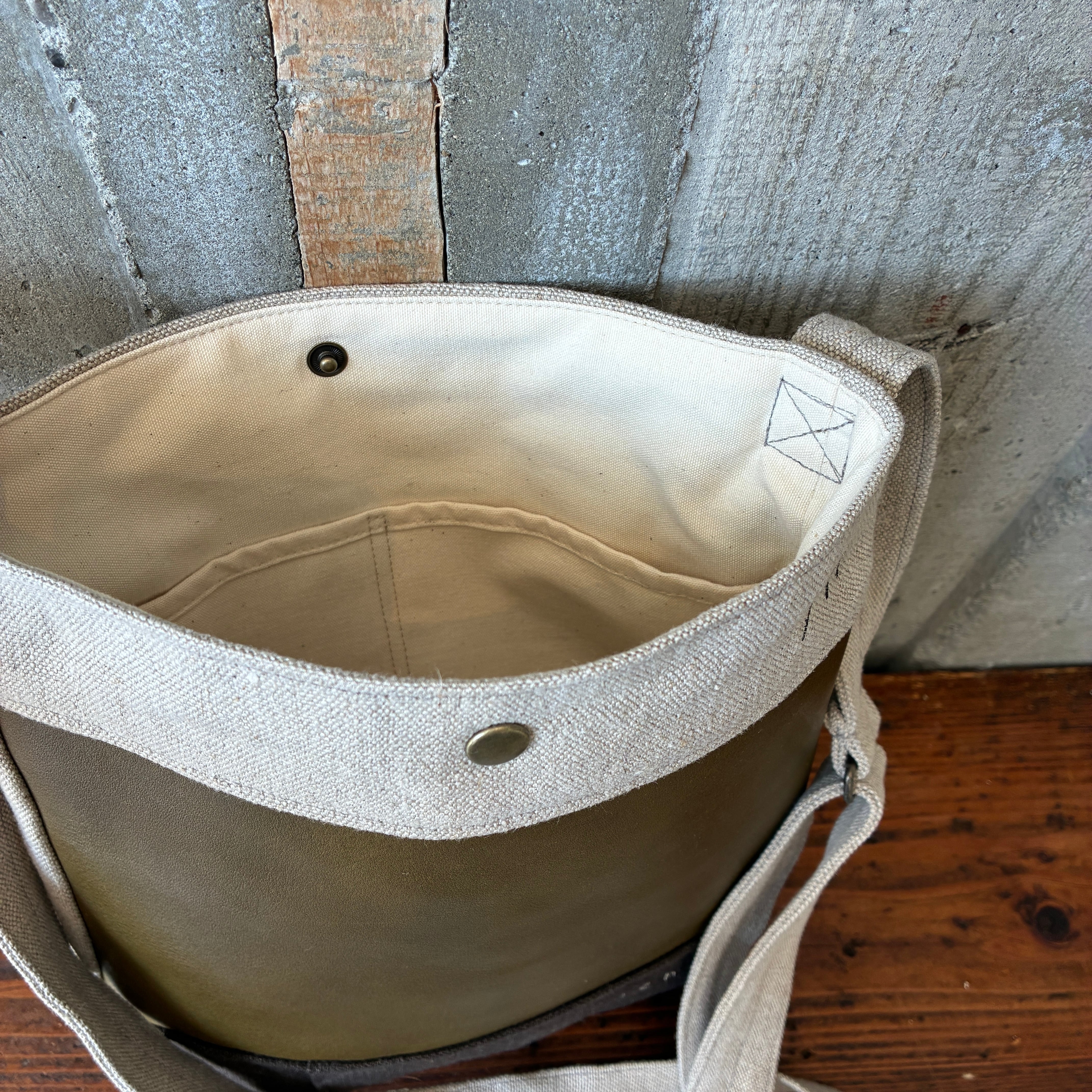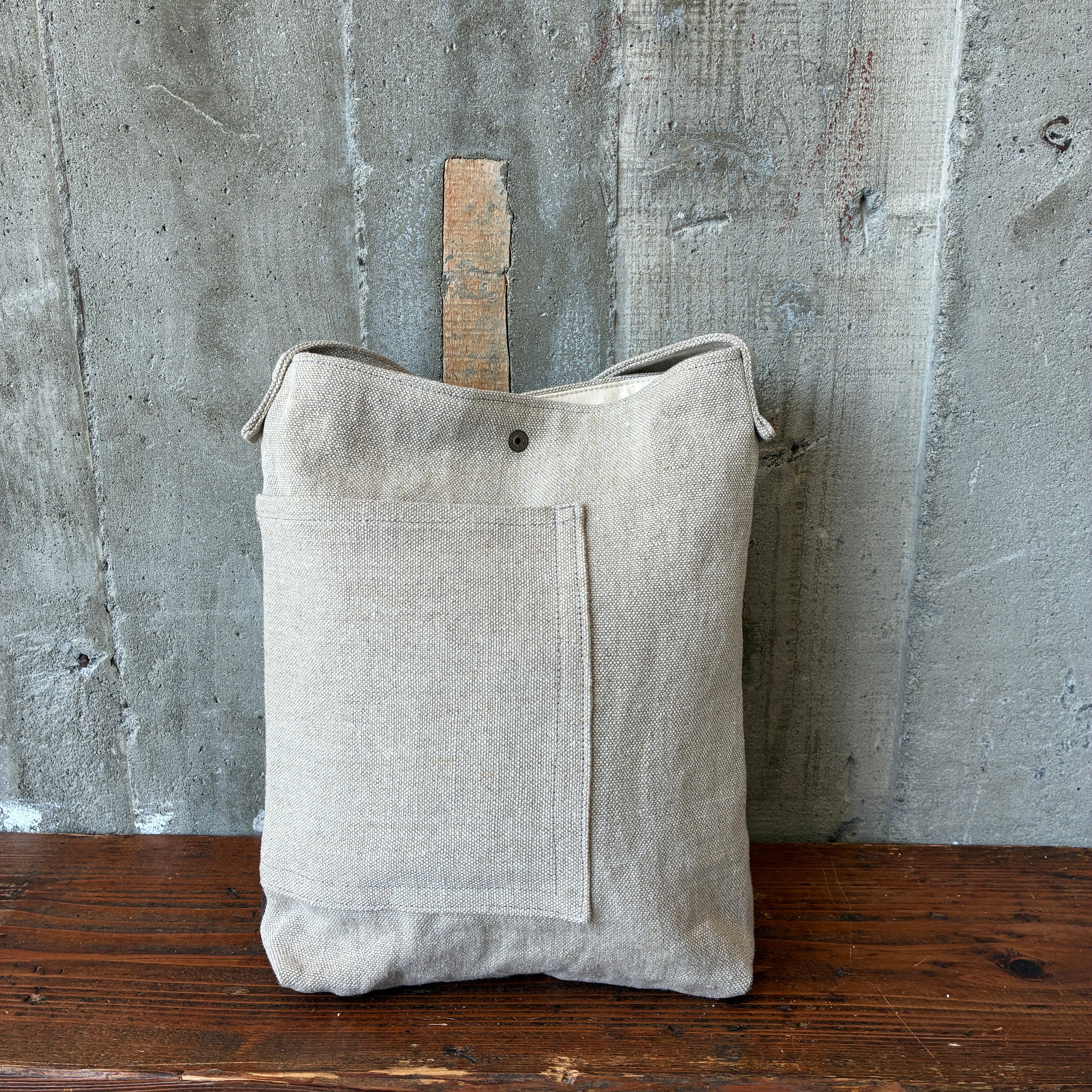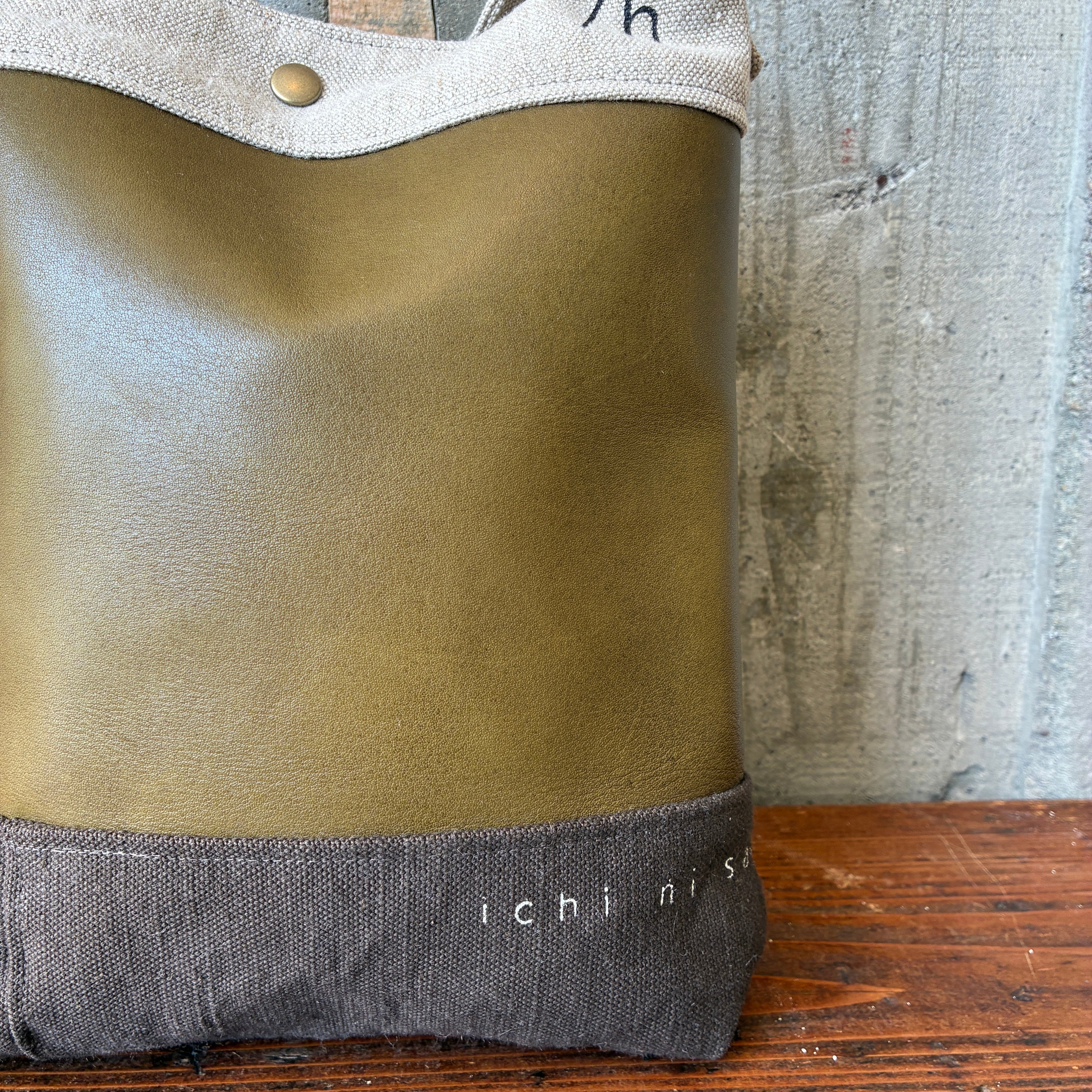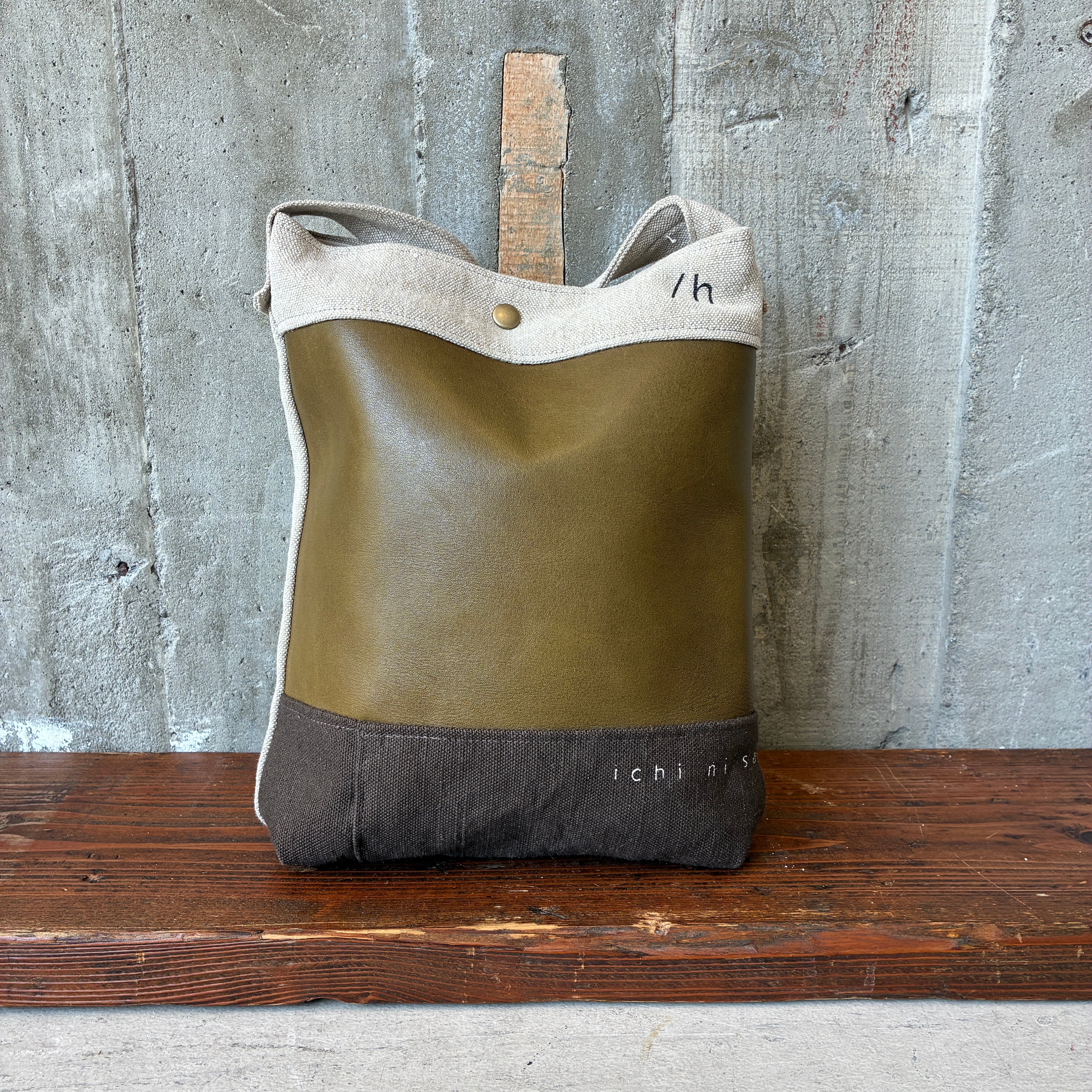 目を引くレザーカラーにナチュラルなリネン色のリネンを合わせ合わせやすいデザインに仕上げました。