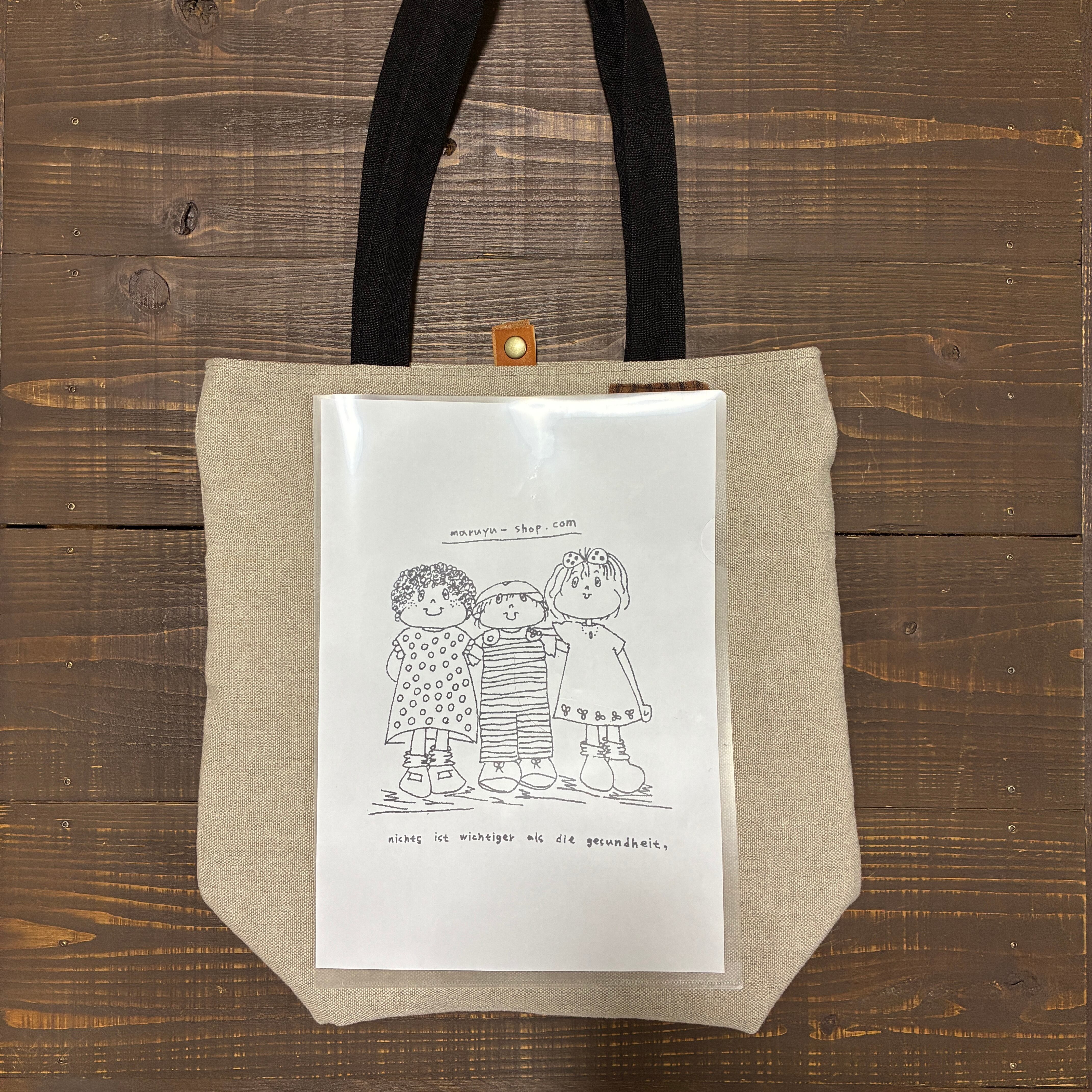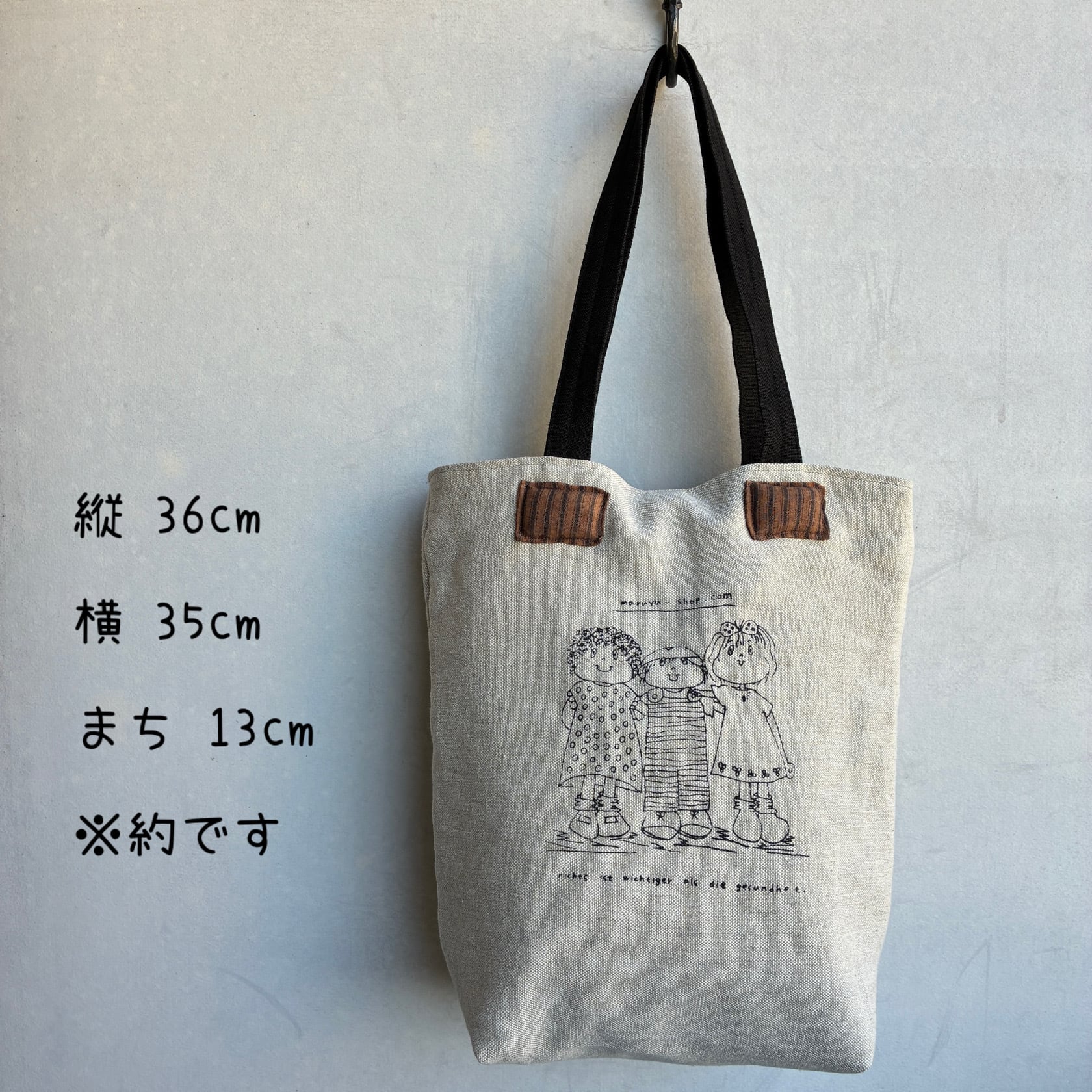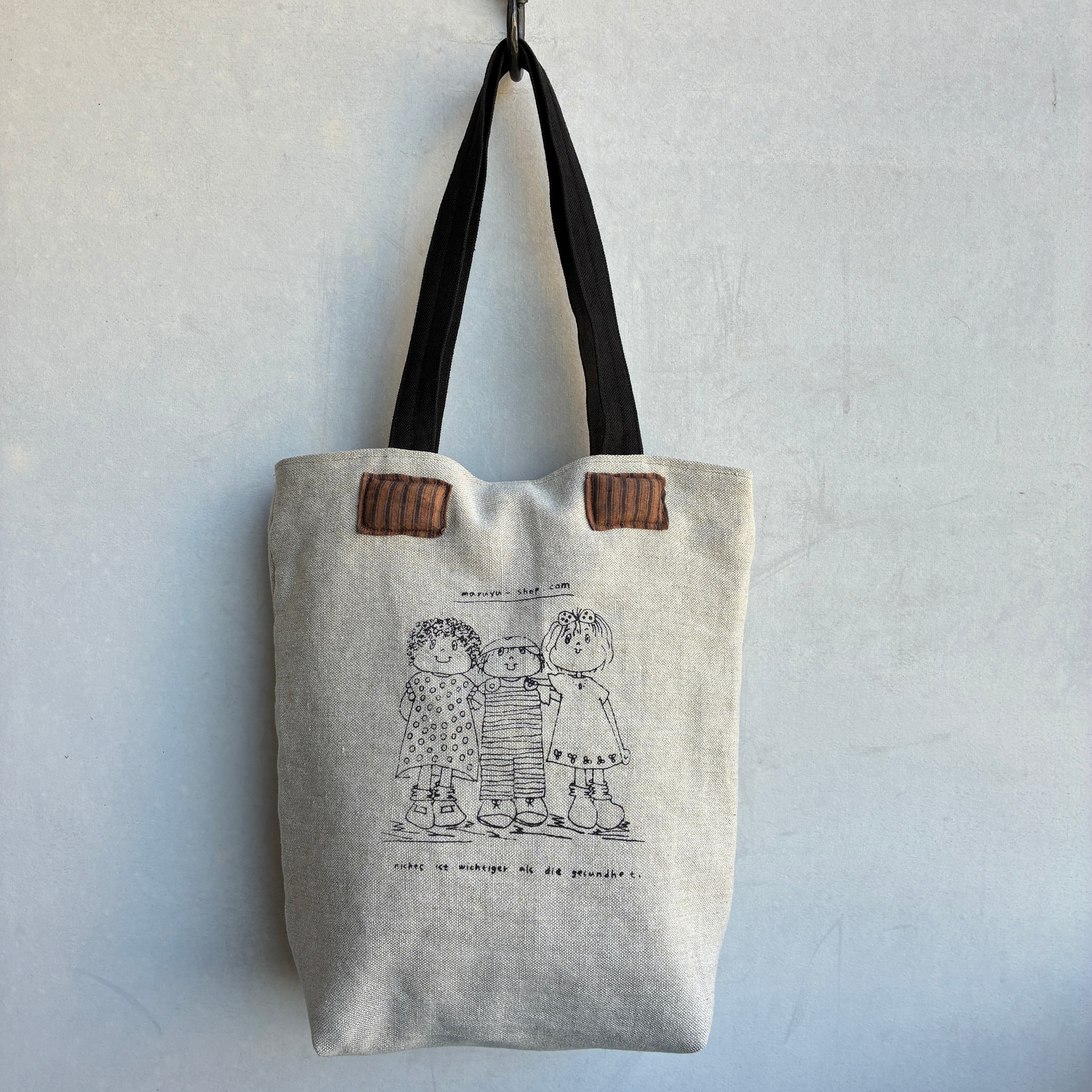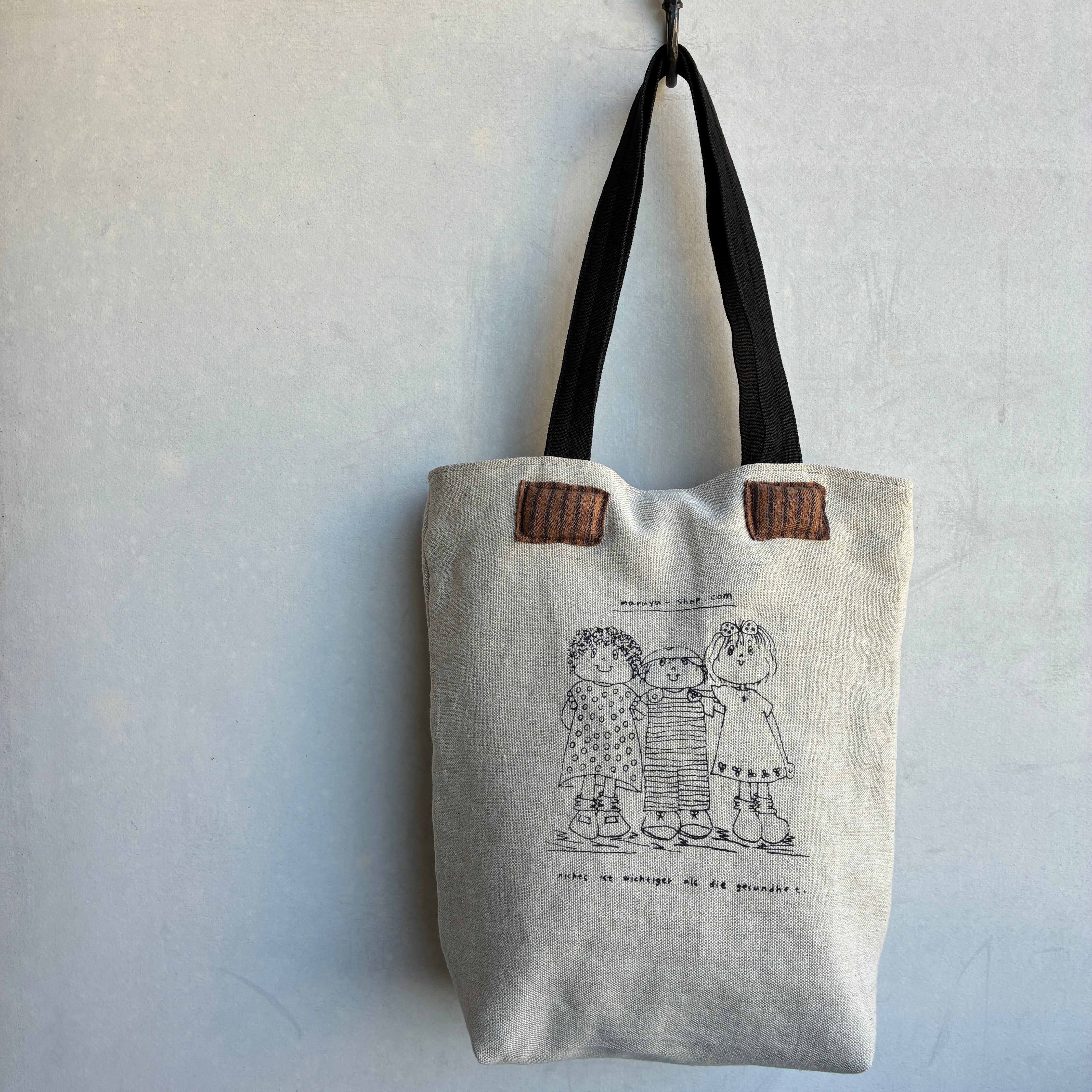 ナチュラルなリネン帆布に、どこか懐かしく優しい雰囲気のデザインをプリントしました。