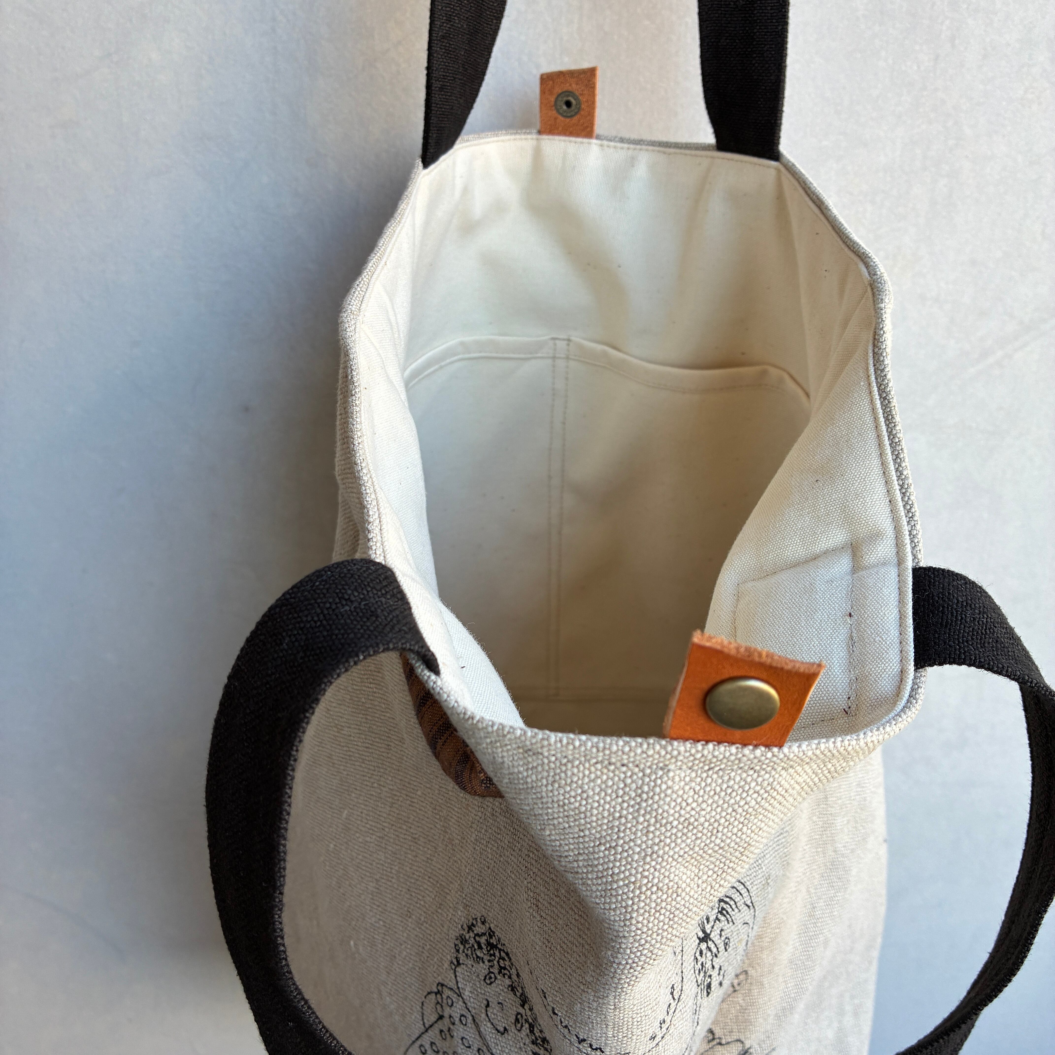 手描きのあたたかみをそのままに、シルクスクリーンで丁寧に仕上げたイラストが魅力のトートバッグ。