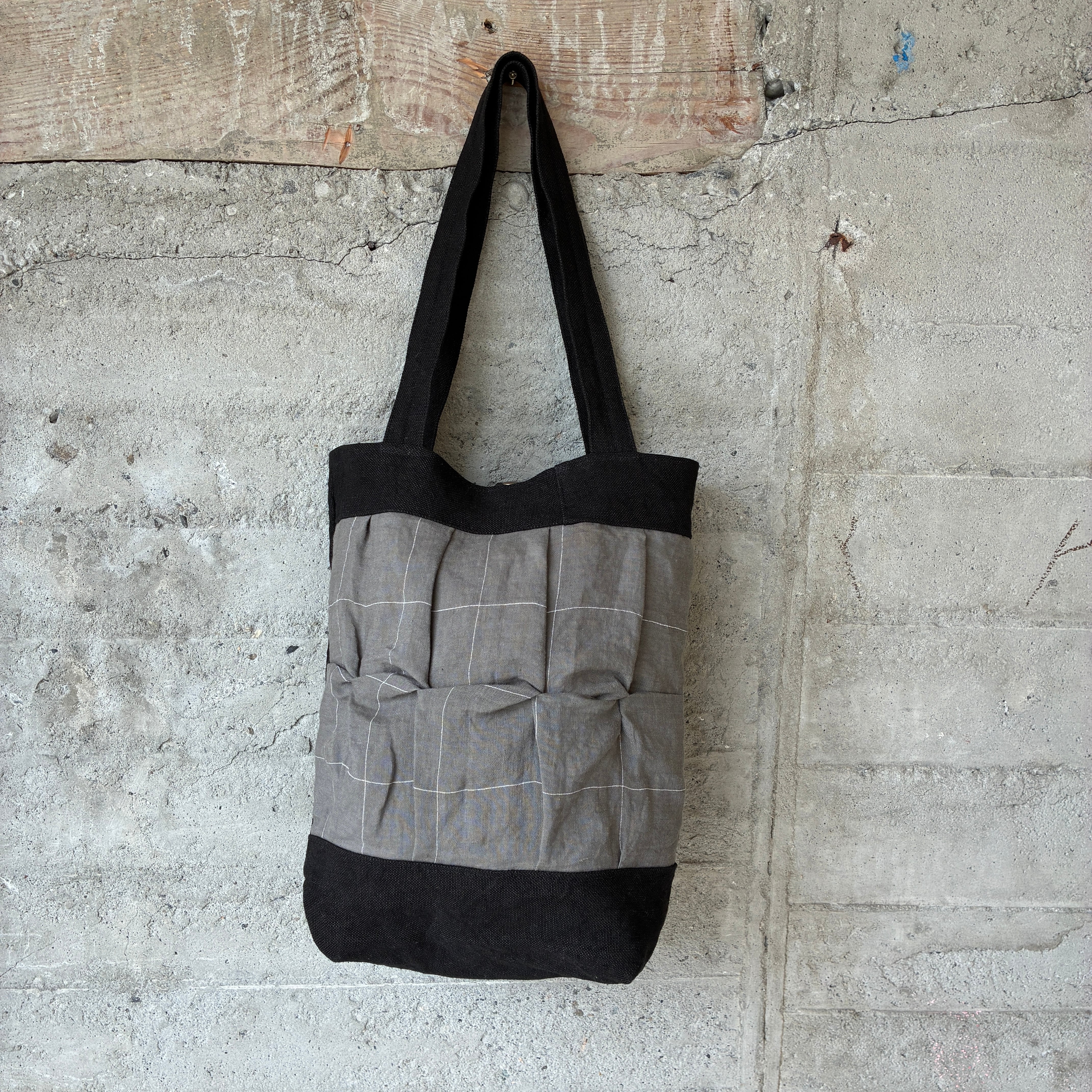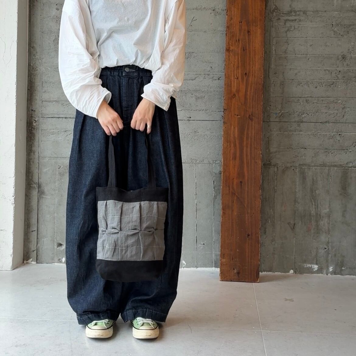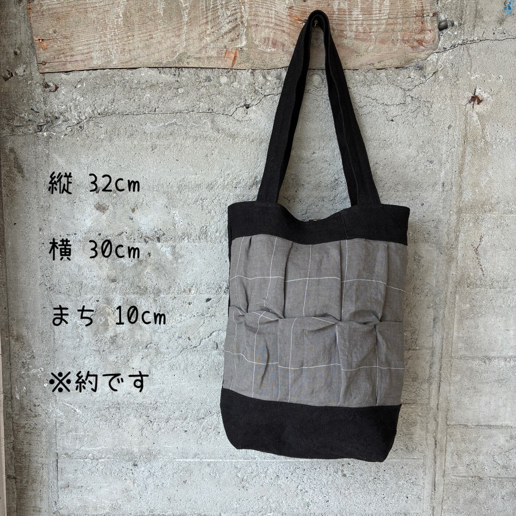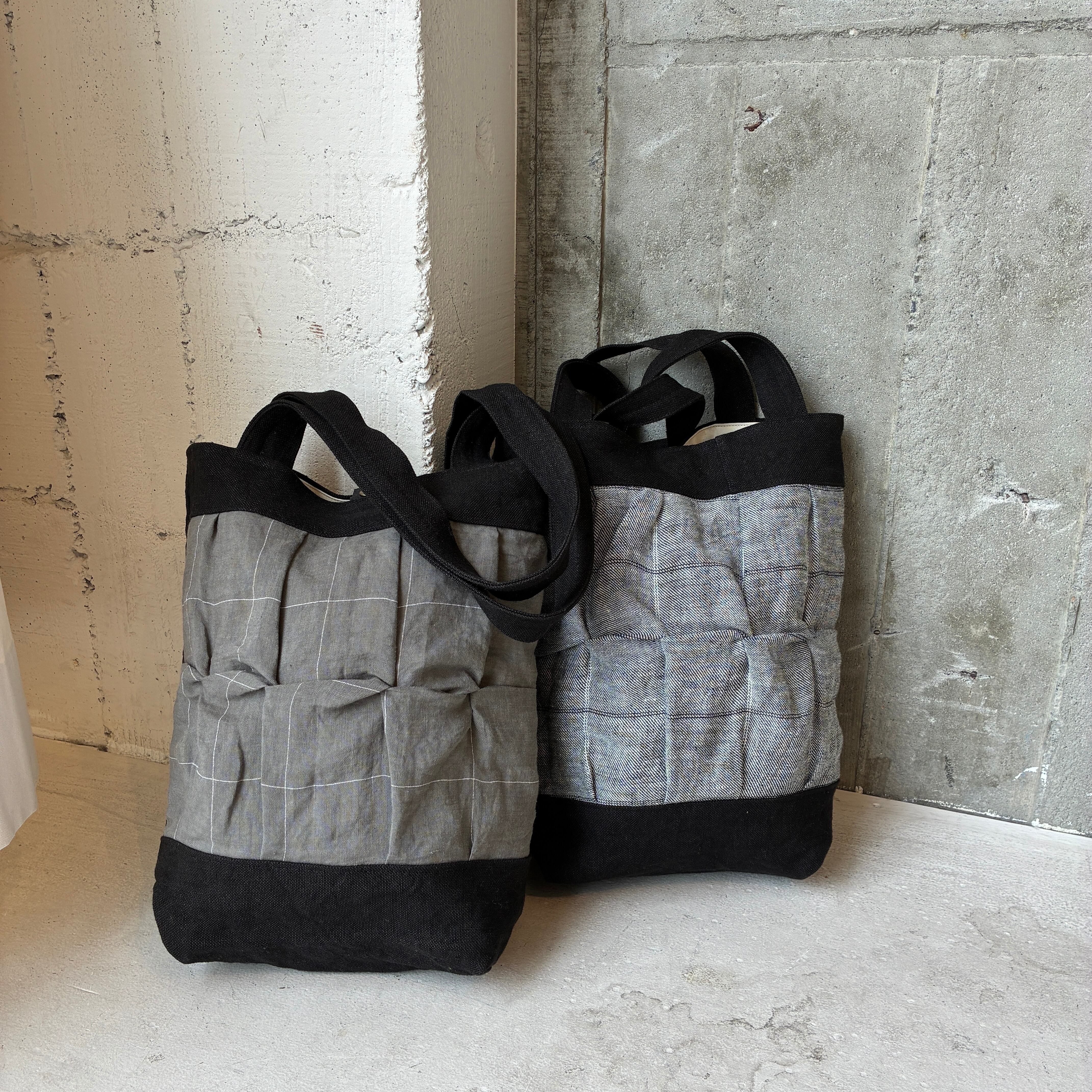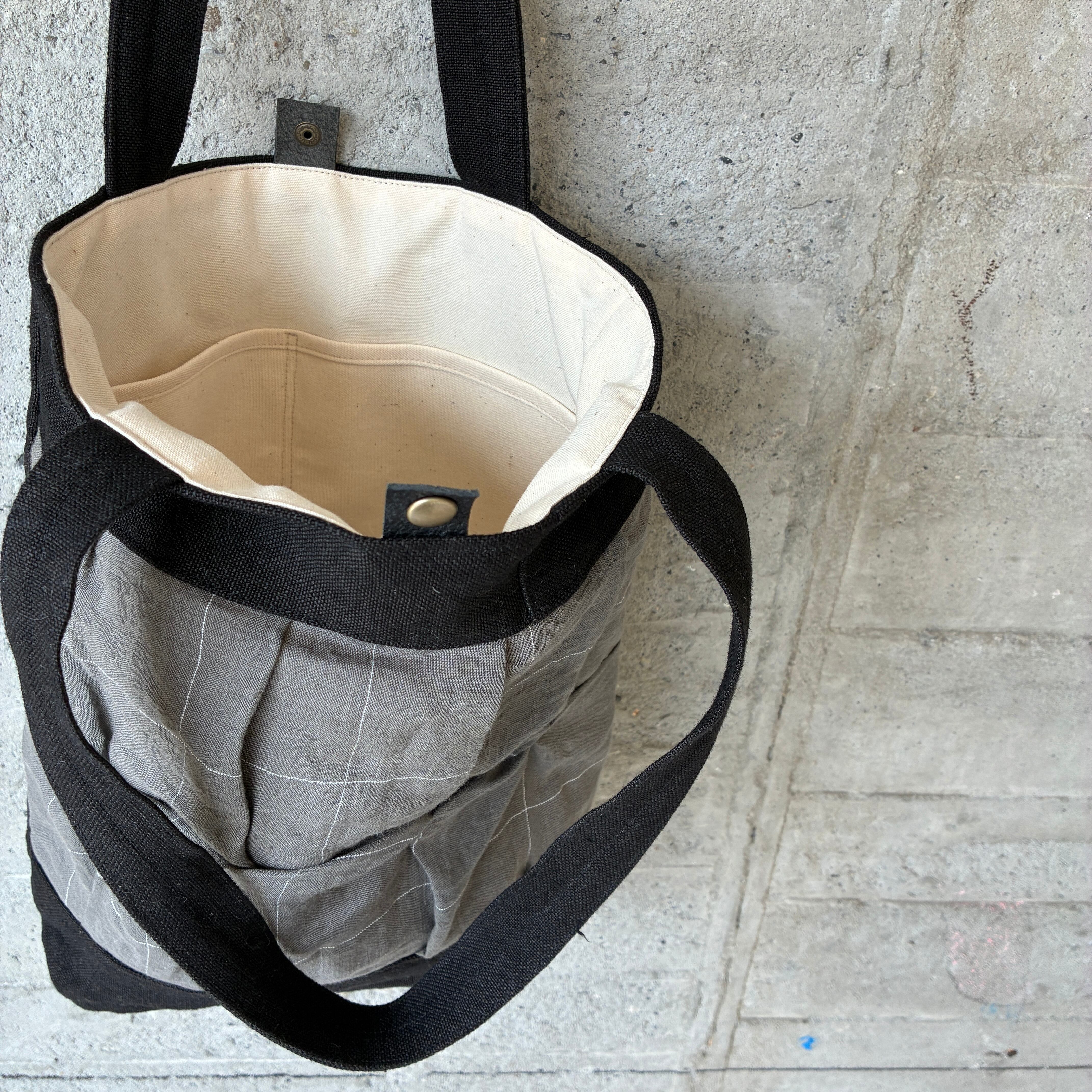表地にはリネン帆布とリネン生地を組み合わせ、ブラックベースにする事により甘すぎない、ナチュラルで落ち着いた雰囲気に仕上げました。内側は丈夫な帆布を使用し、見た目の軽やかさと実用性を両立。
