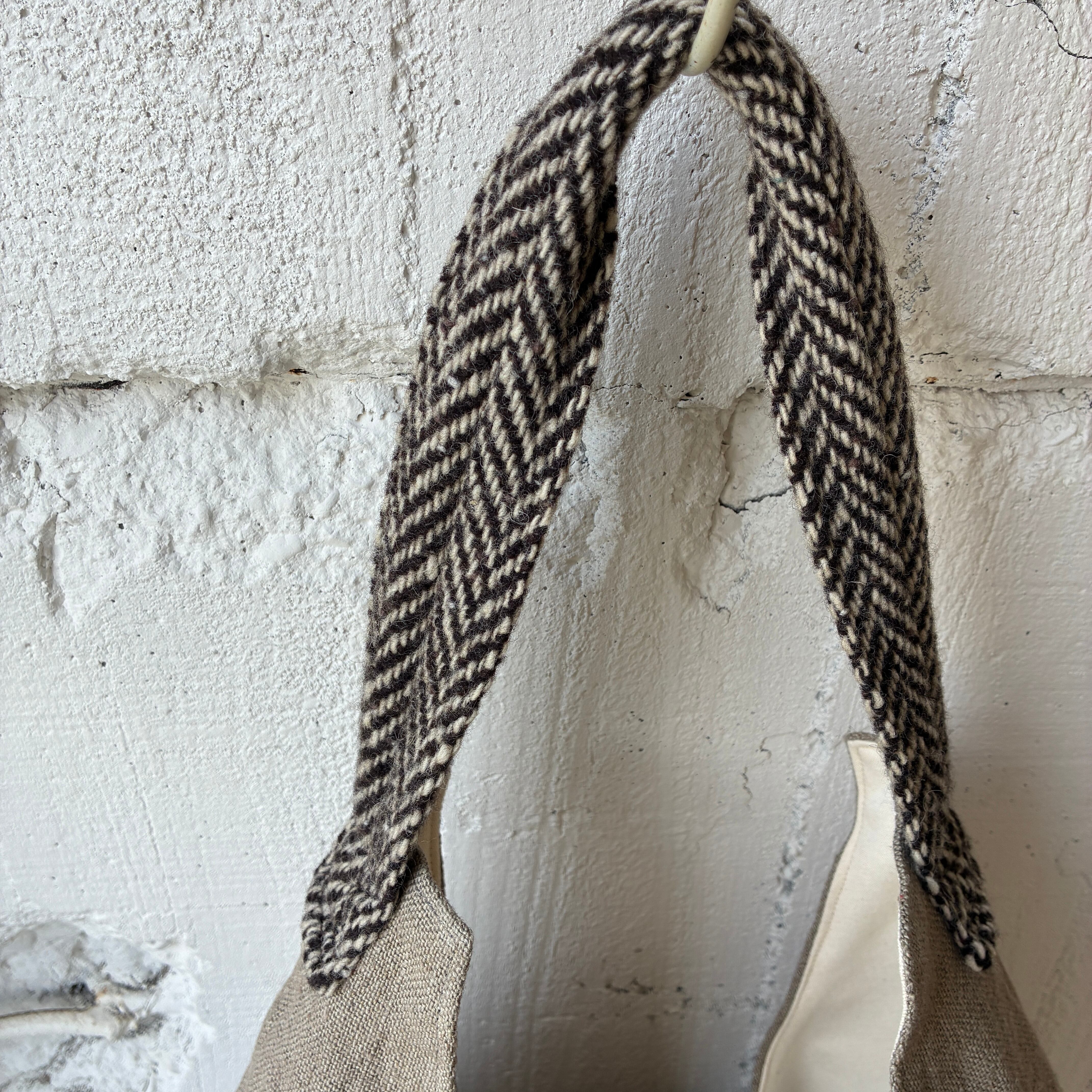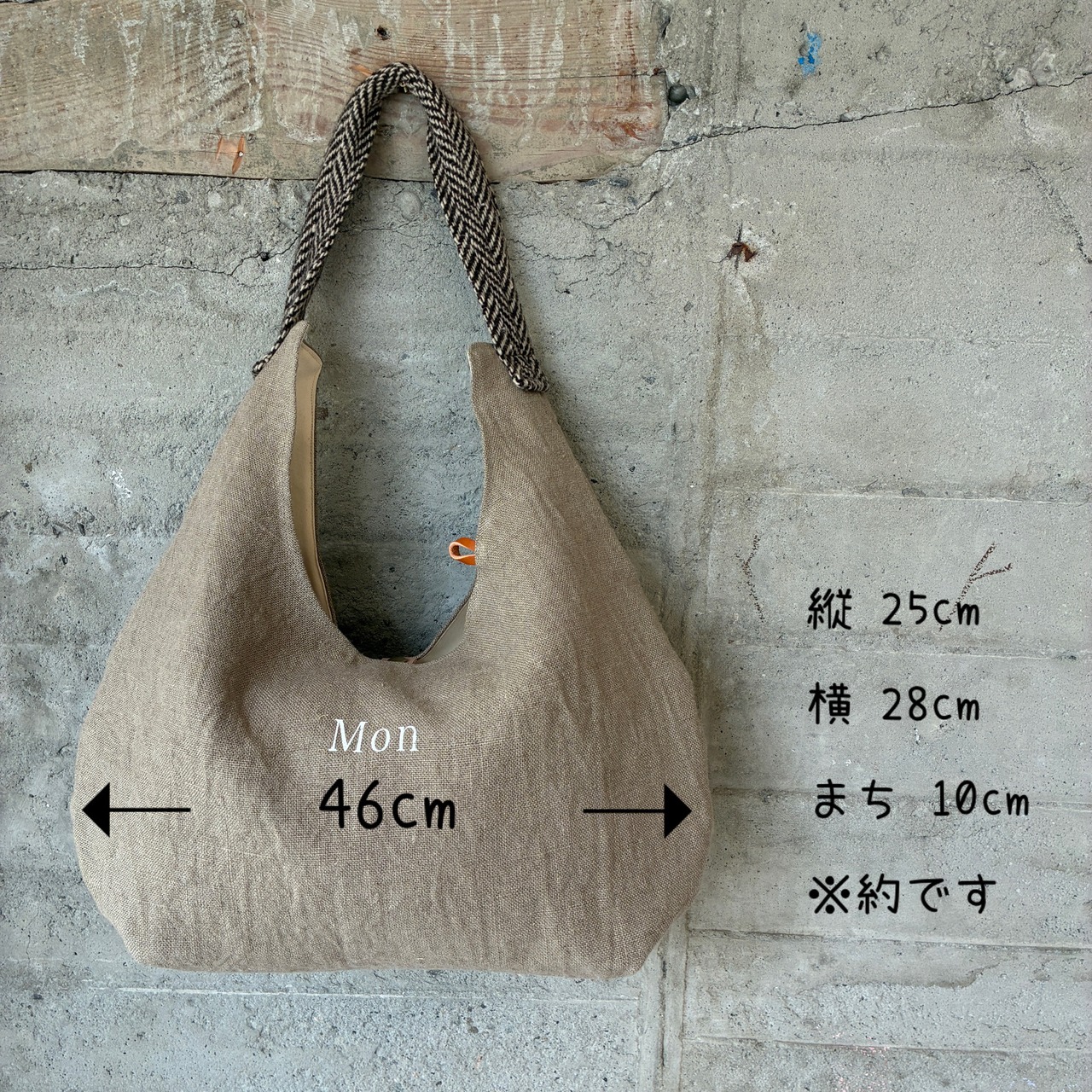 裏地には丈夫な帆布を使用し、しっかりとした仕立て。大きめの内ポケット付きで、小物の収納にも便利です。外側のポケットもアクセントになり、デザイン性と実用性を兼ね備えています。