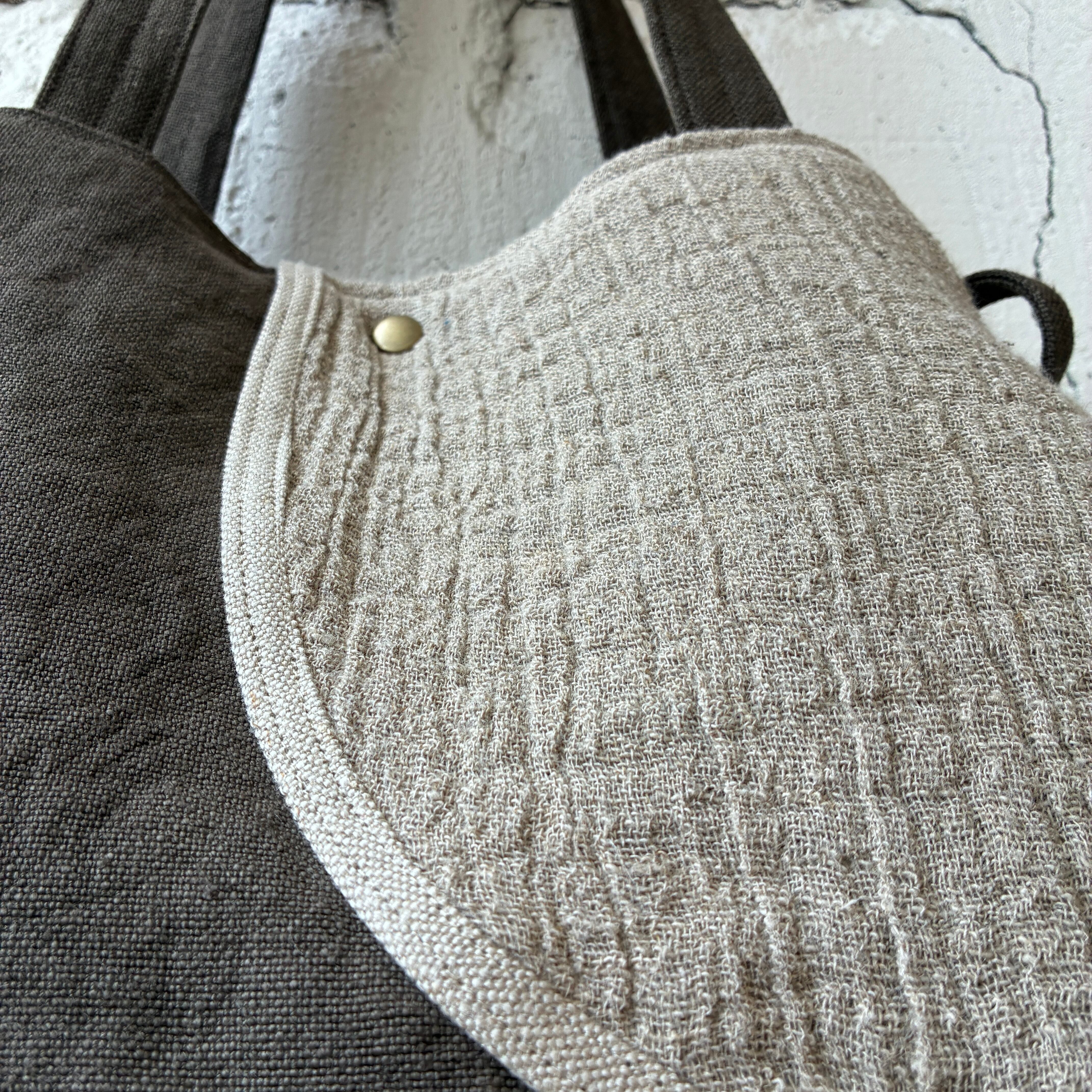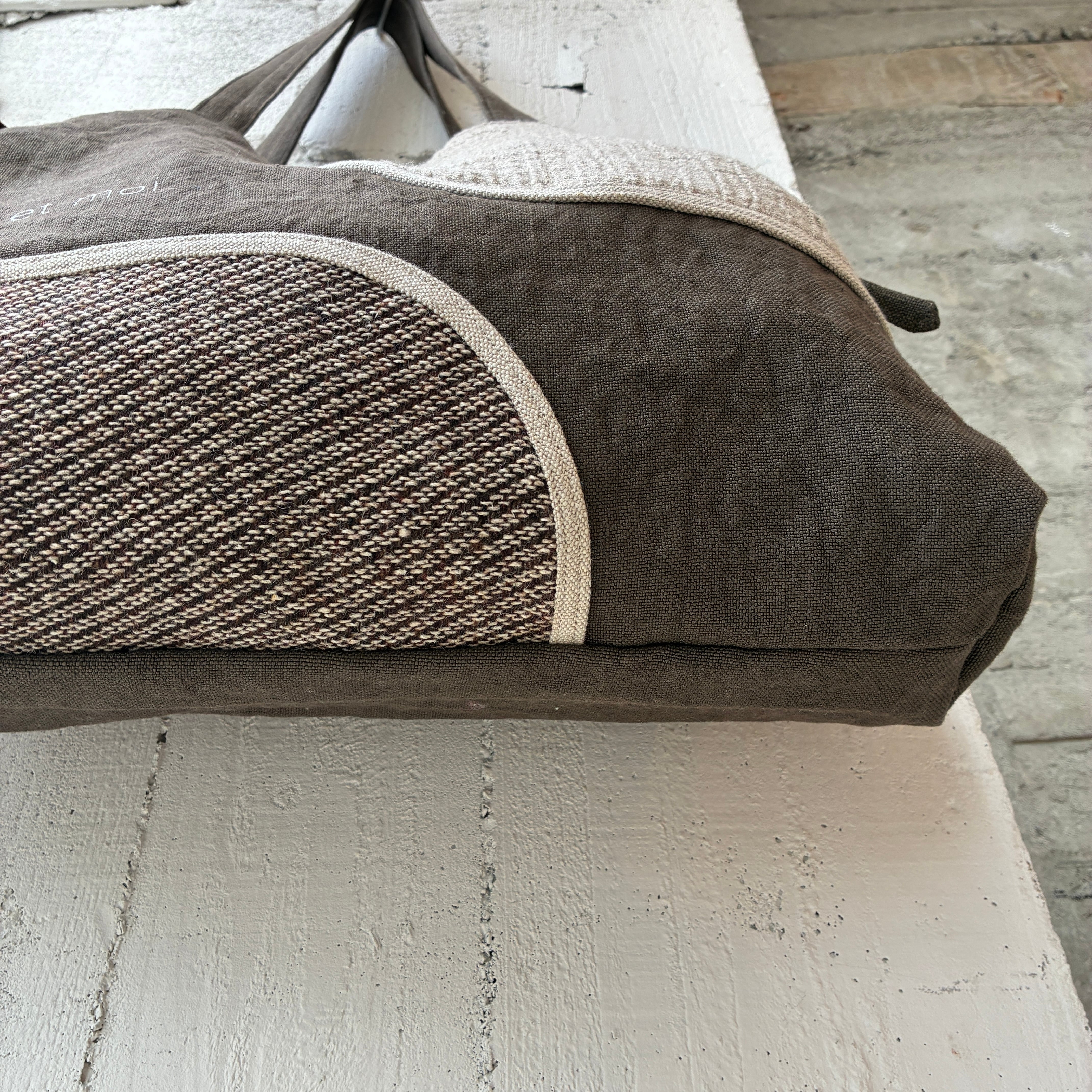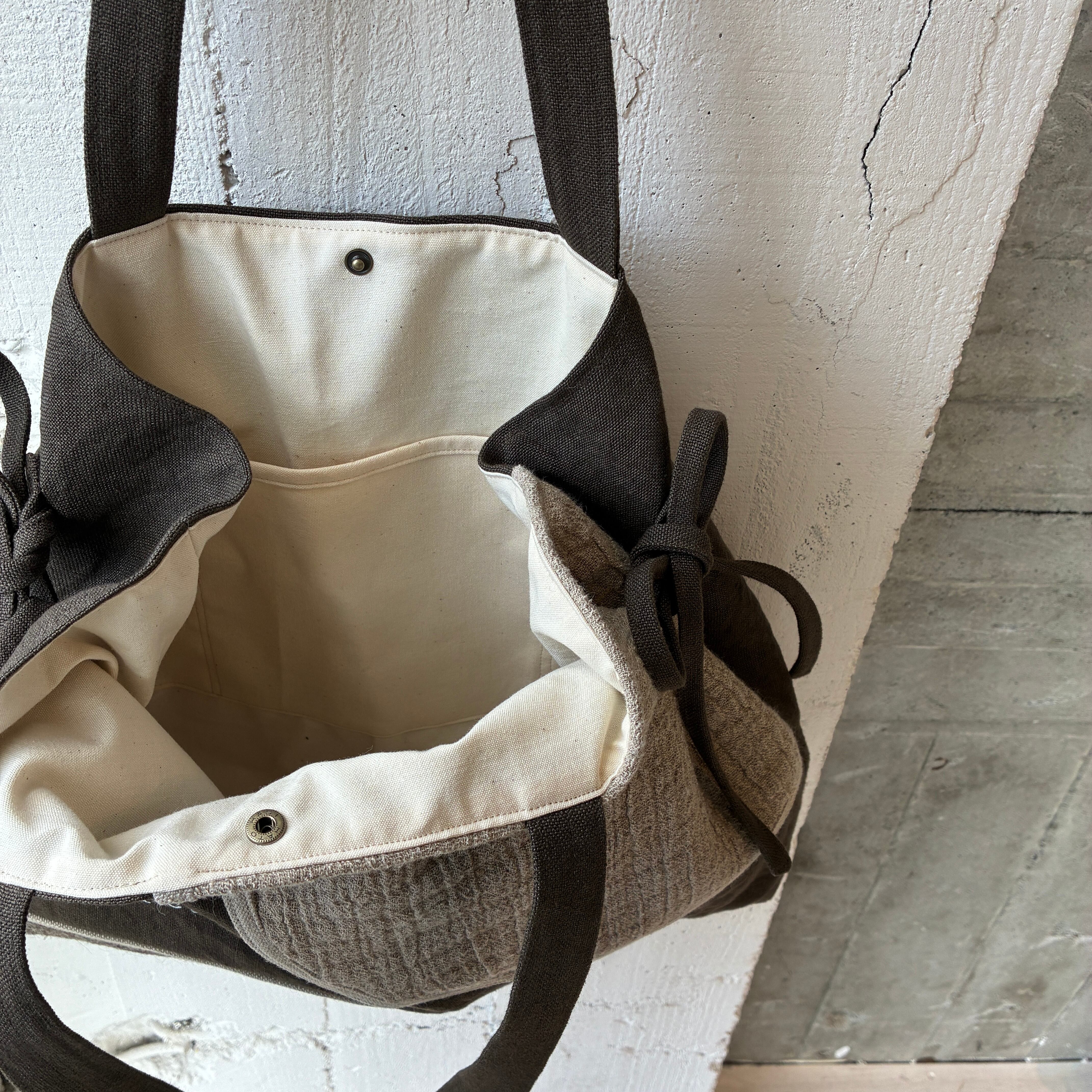 ブラウンのリネン帆布に遊び心を加えたデザインに仕上げた maruyuオリジナルリボントートです。