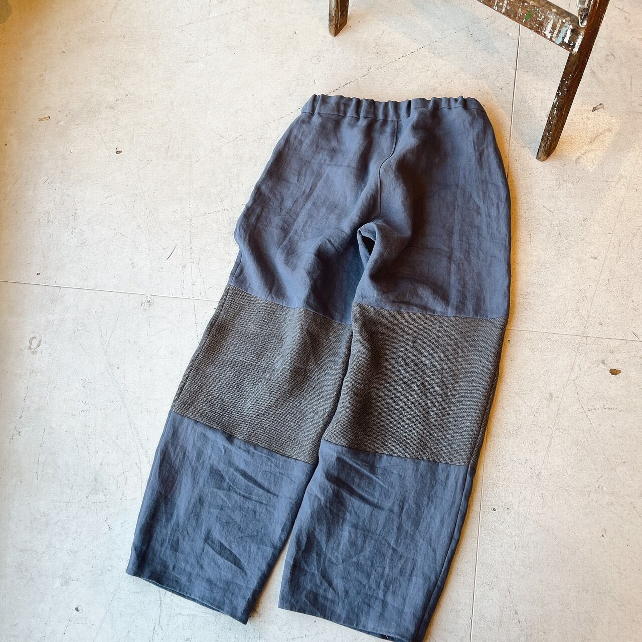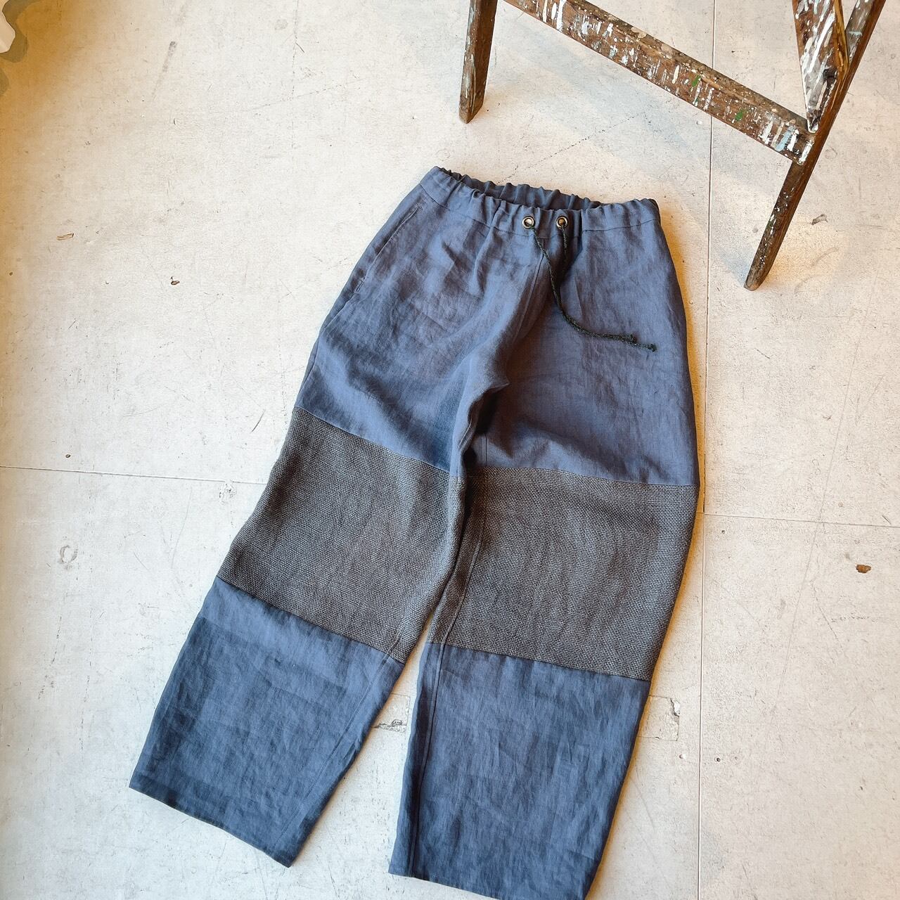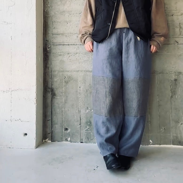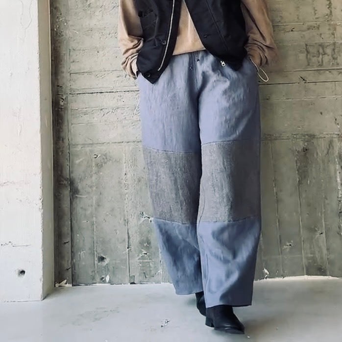 バイカラーデザインのリネンパンツ。