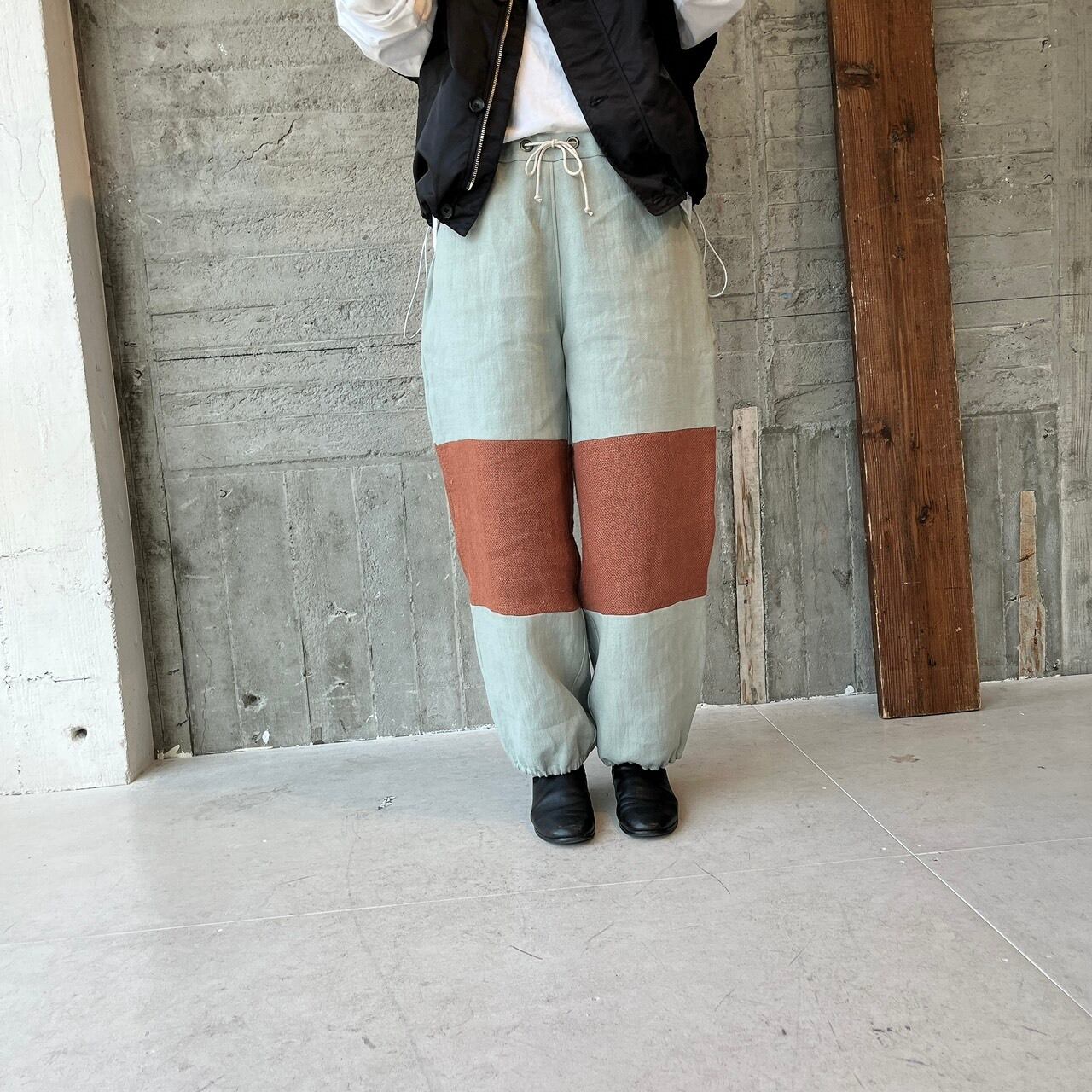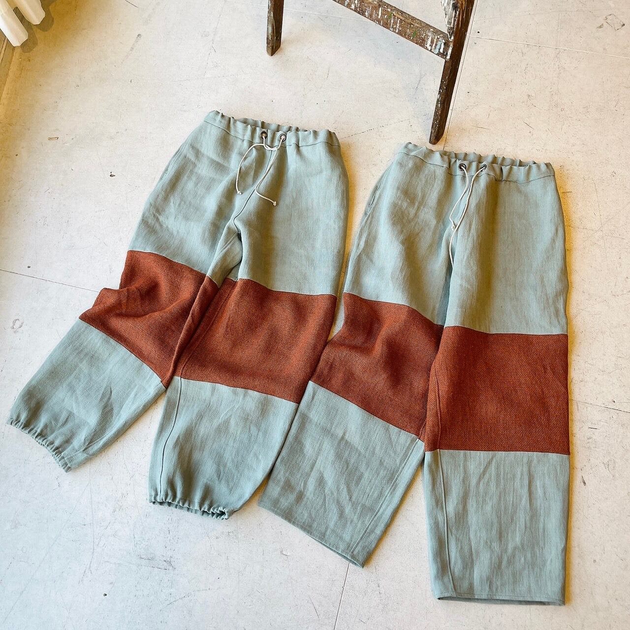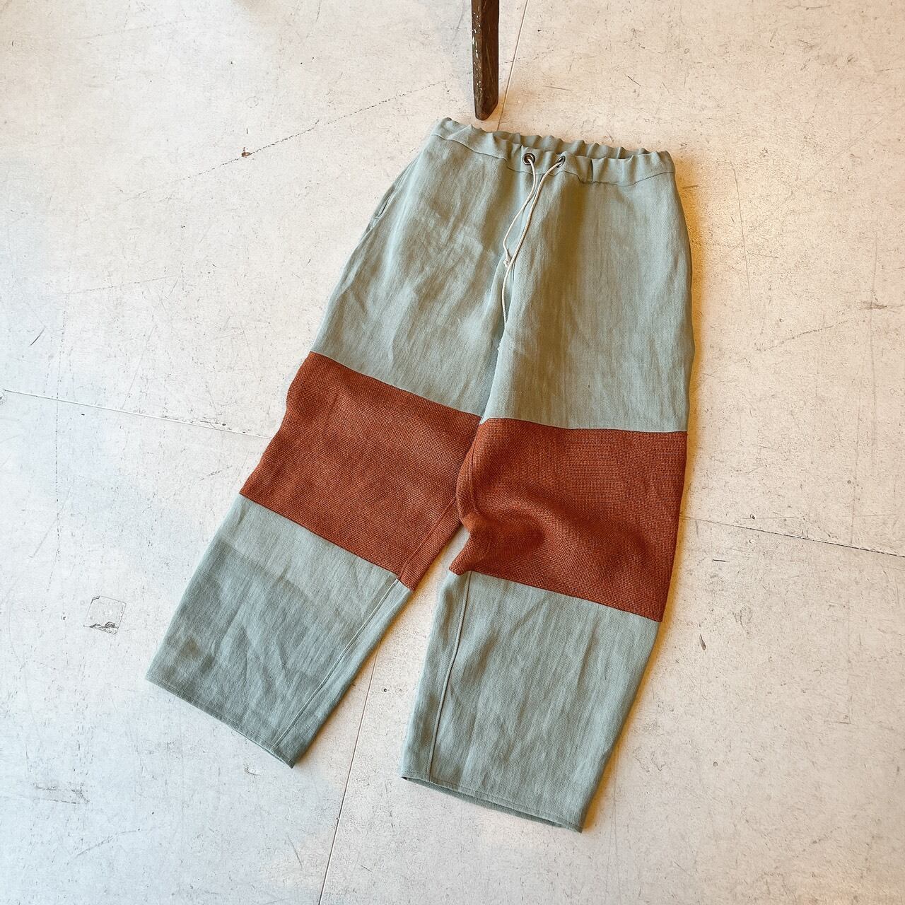 バイカラーデザインのリネンパンツ。