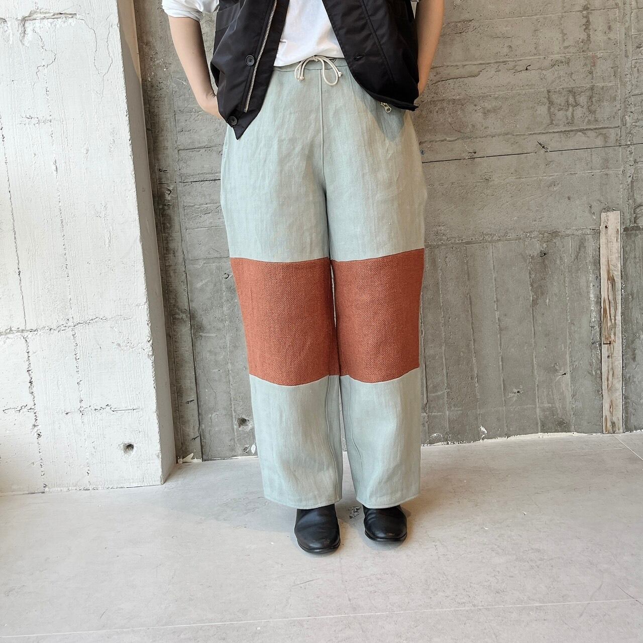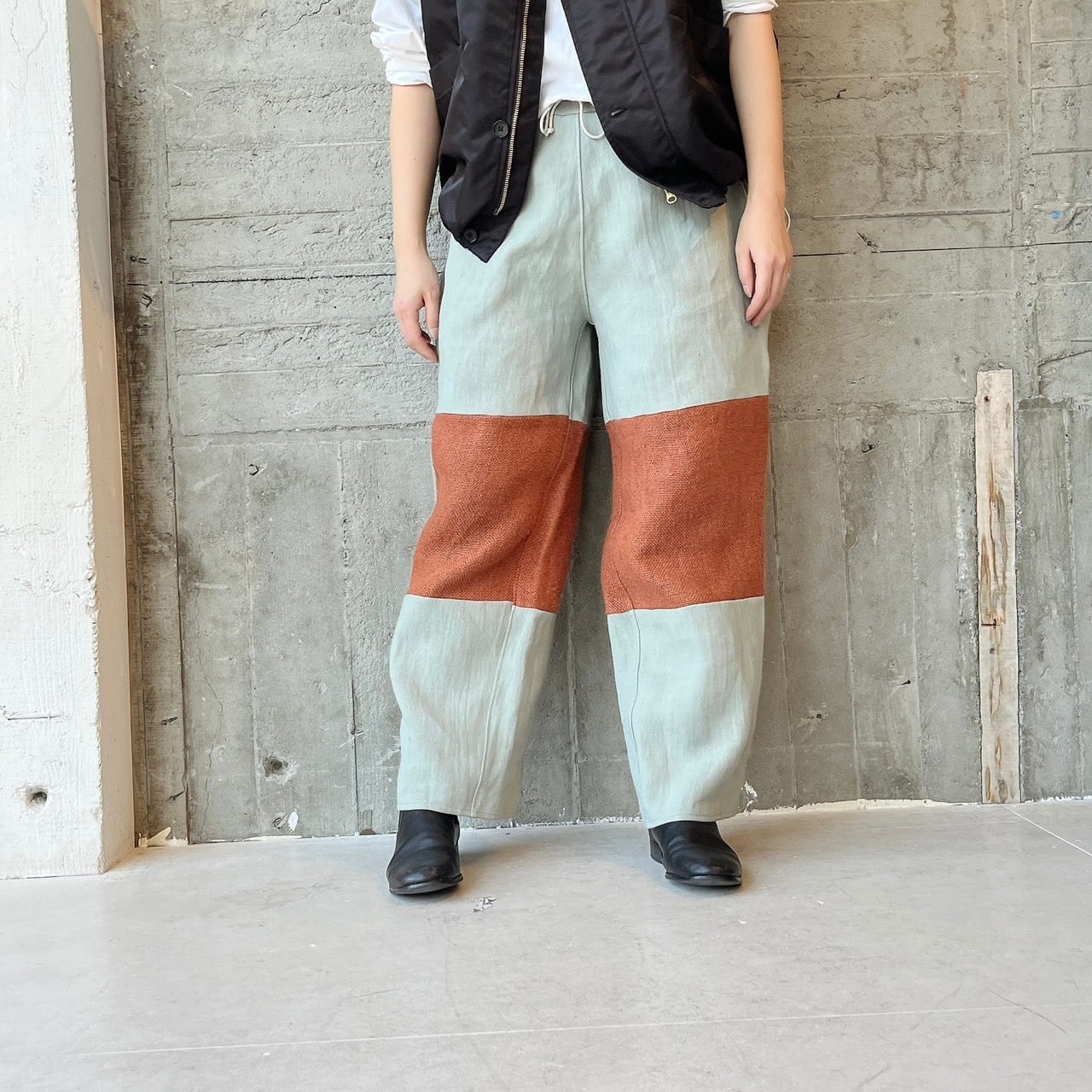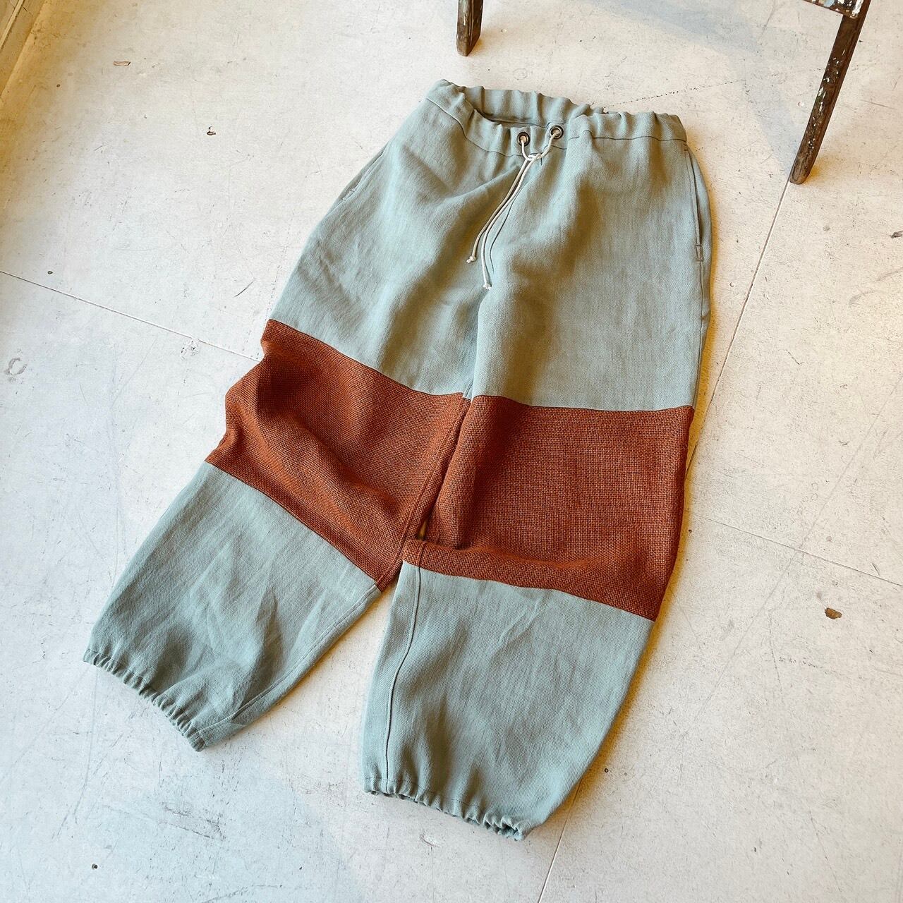 バイカラーデザインのリネンパンツ。