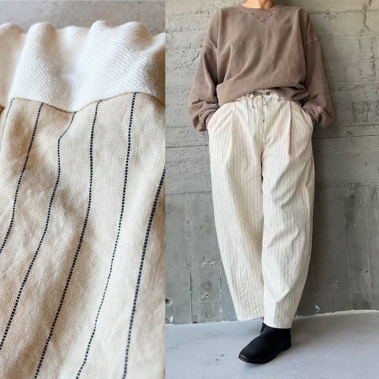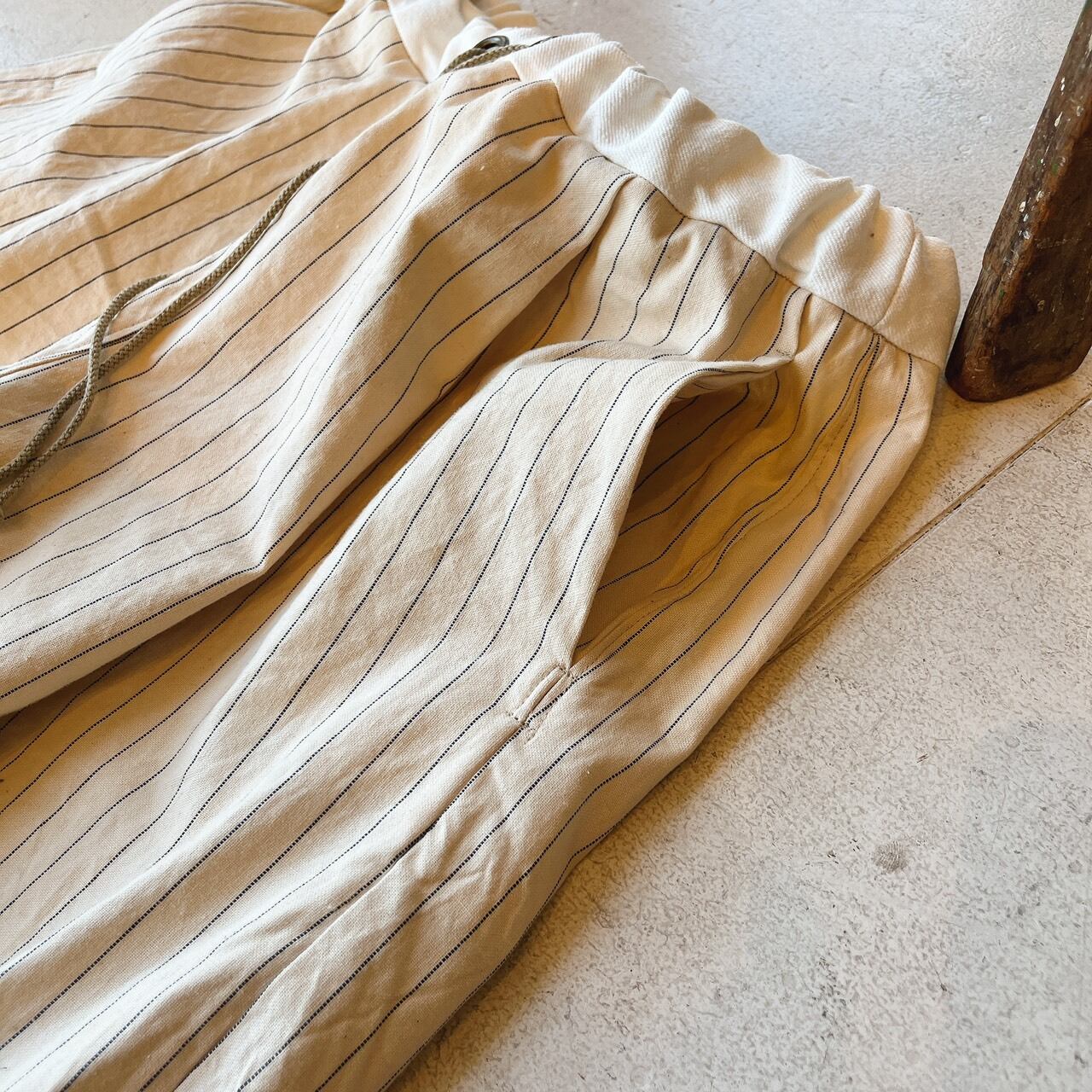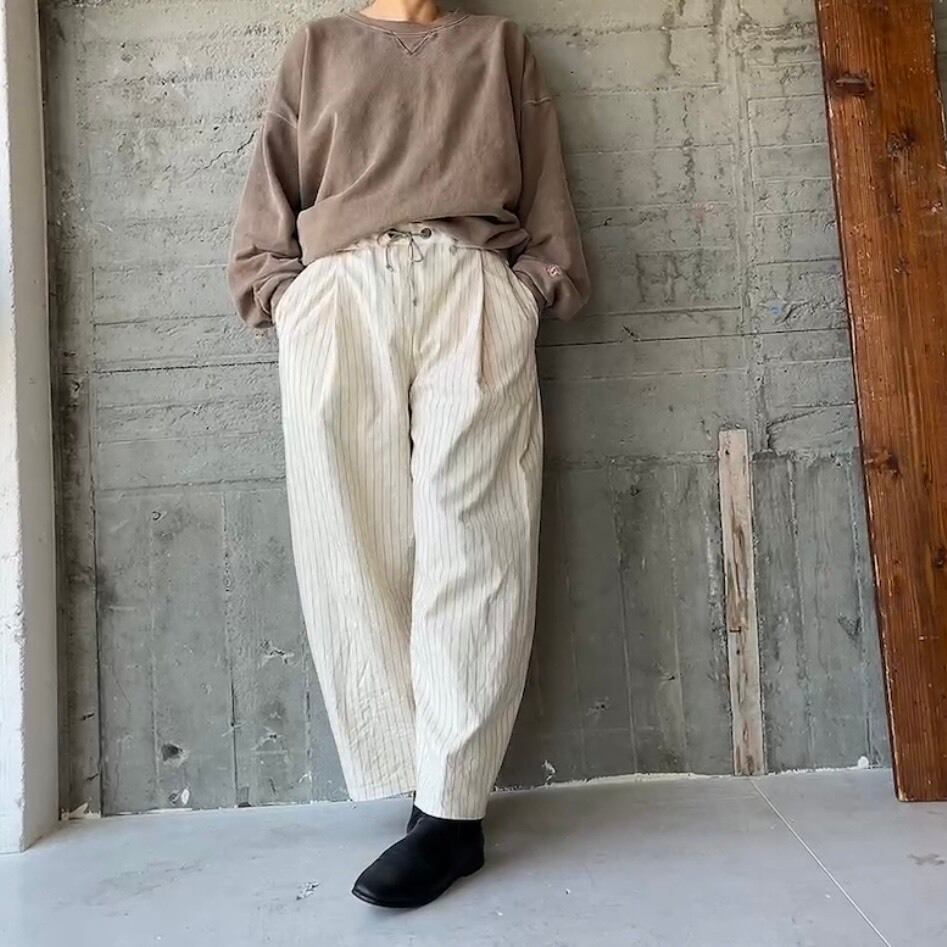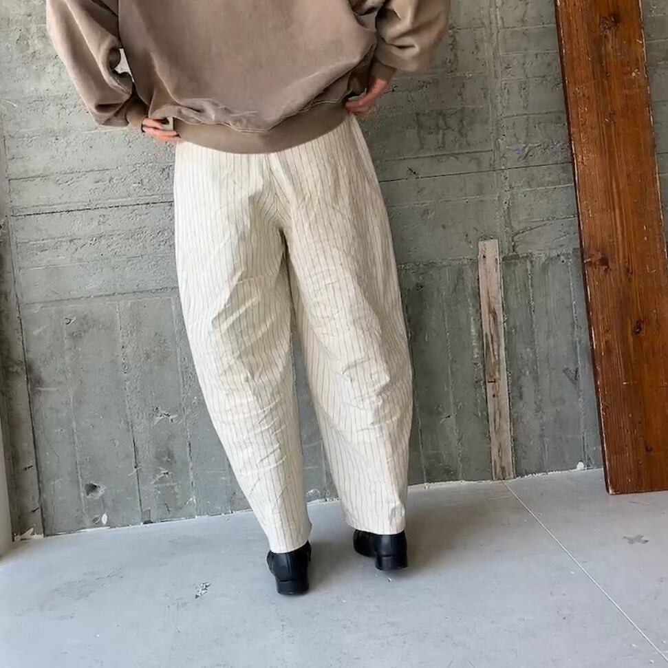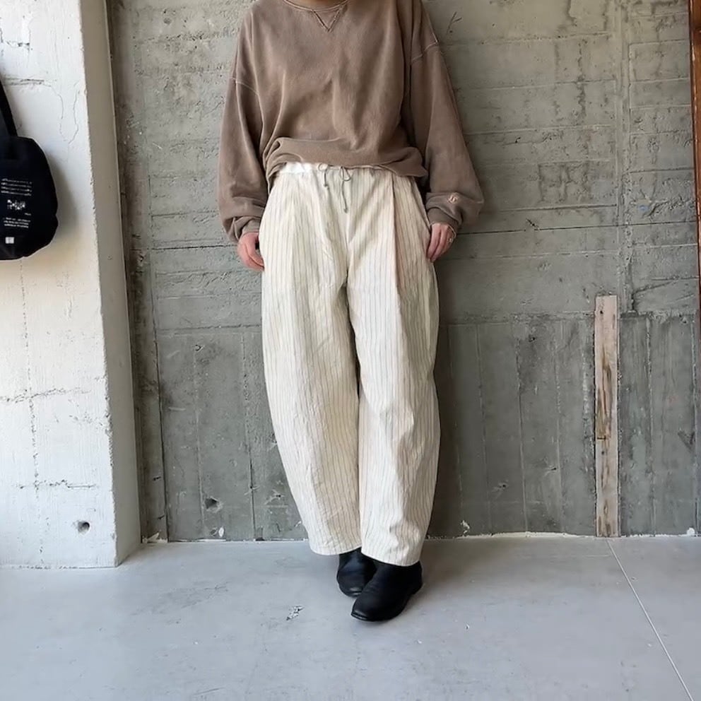 オフホワイトにネイビーラインが可愛いくナチュラルなオックスライトキャンバス素材のパンツ