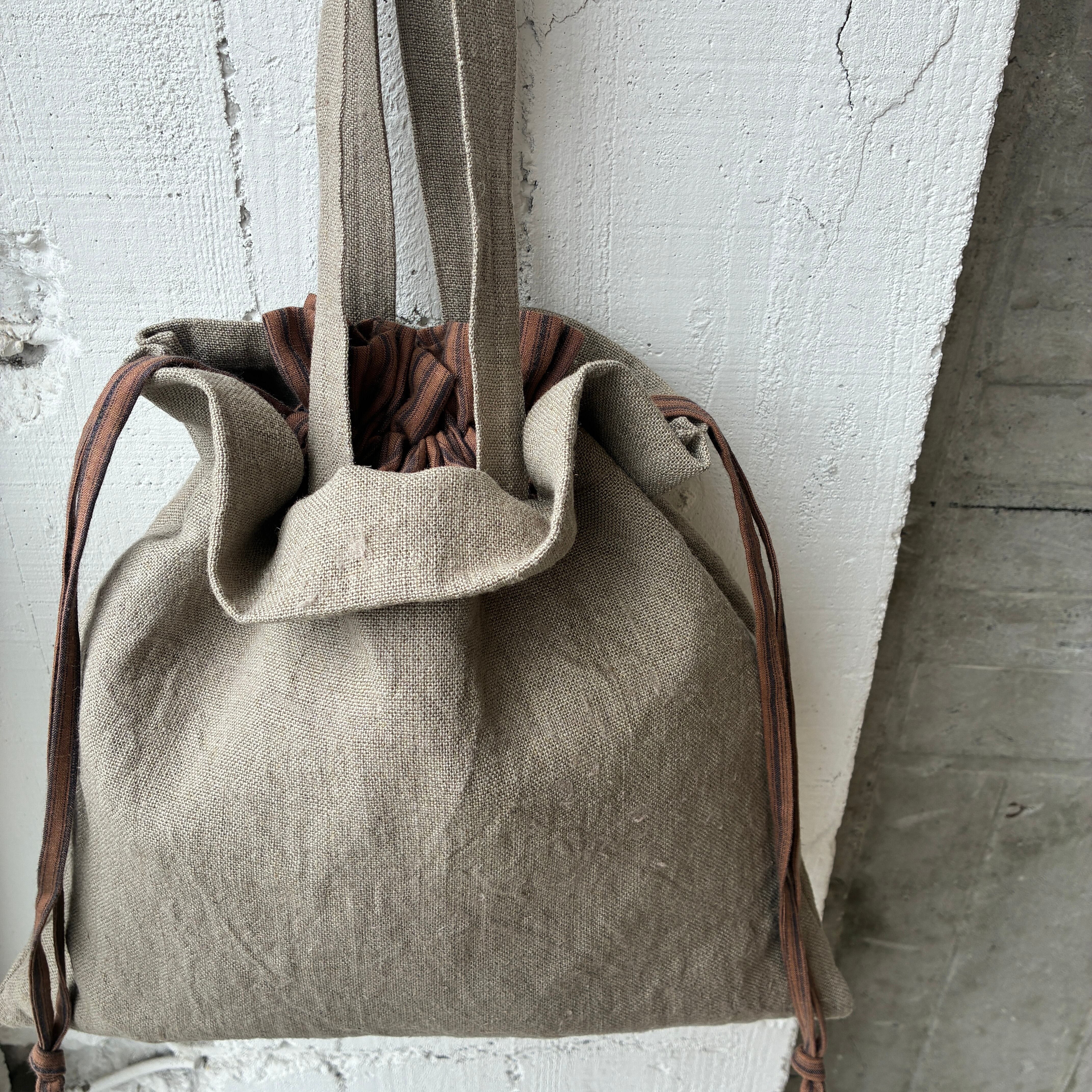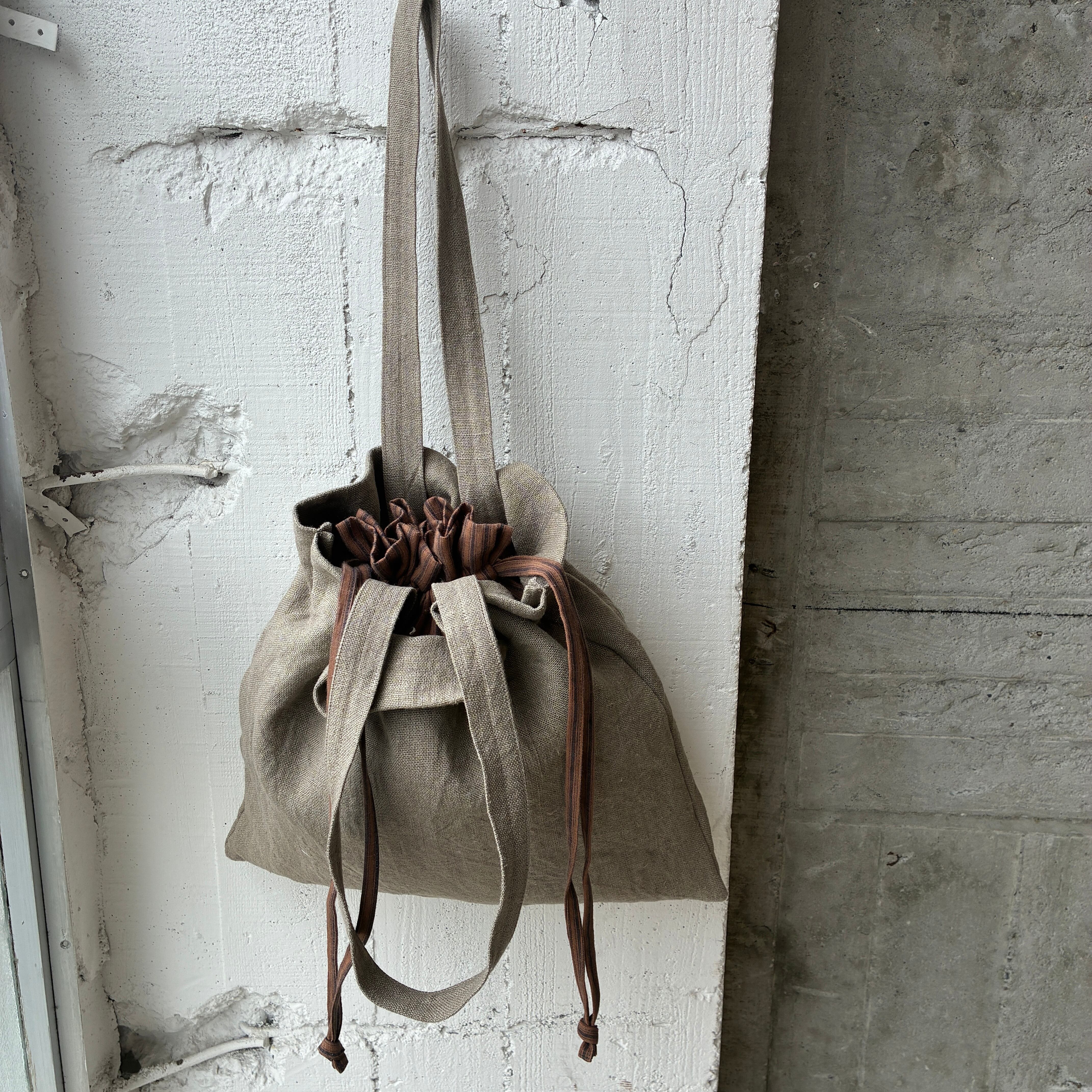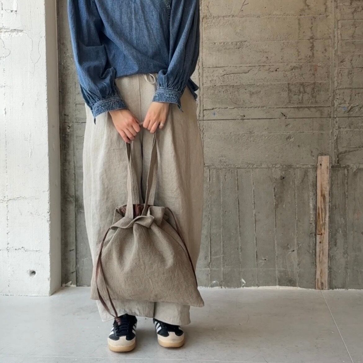 くったりリネンに、内側を巾着仕様にしたデザイン。