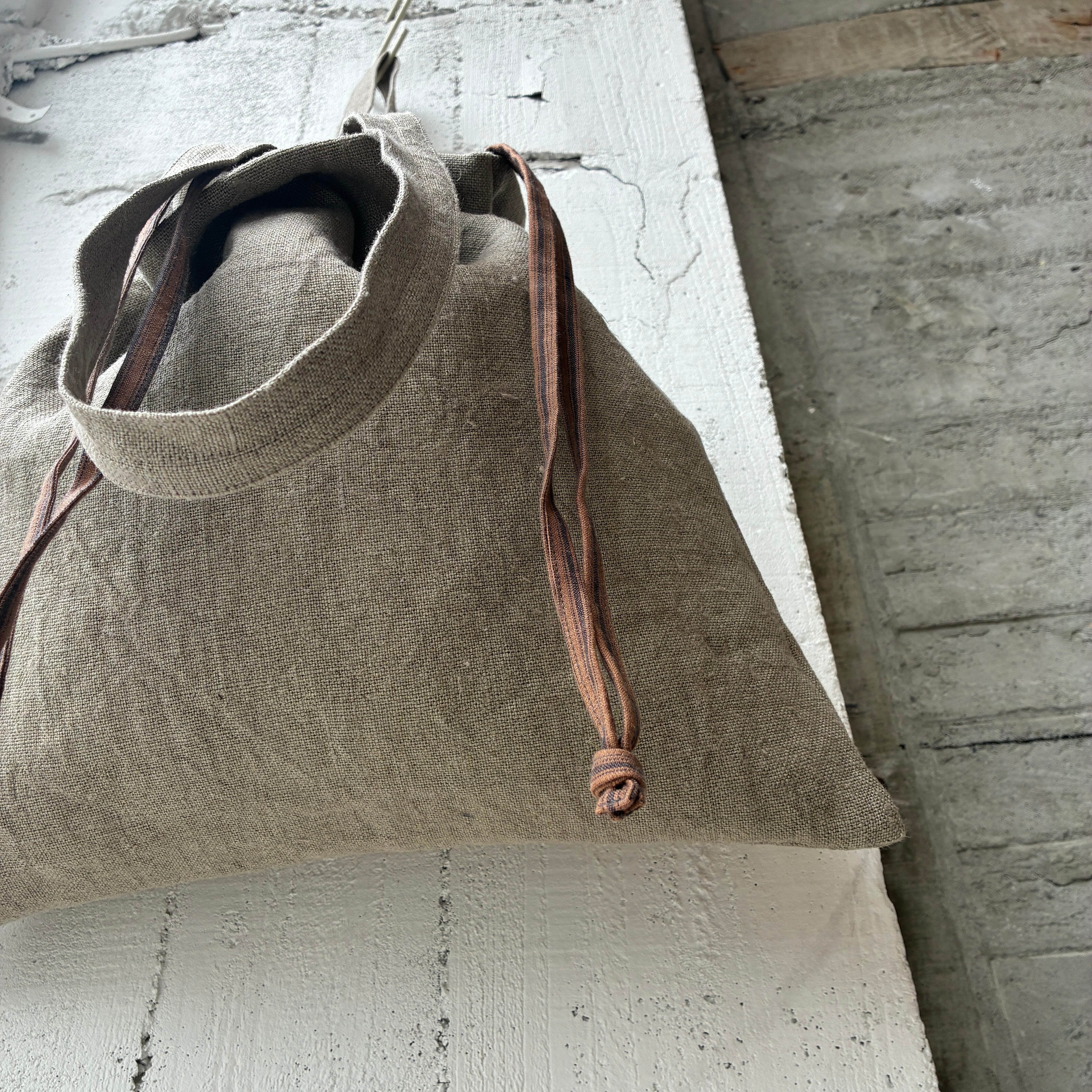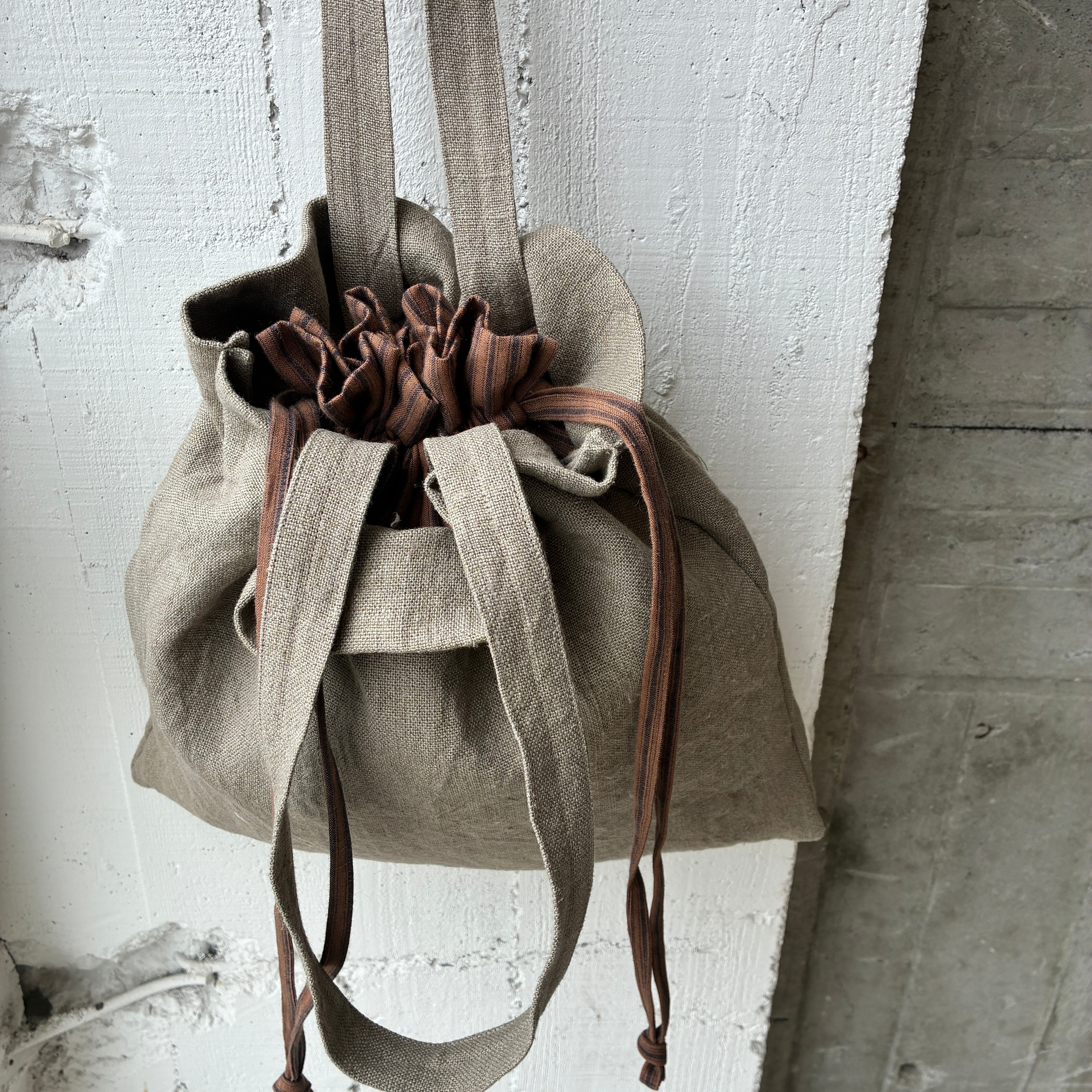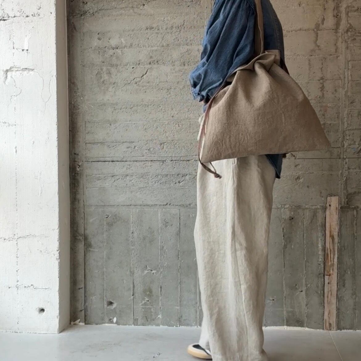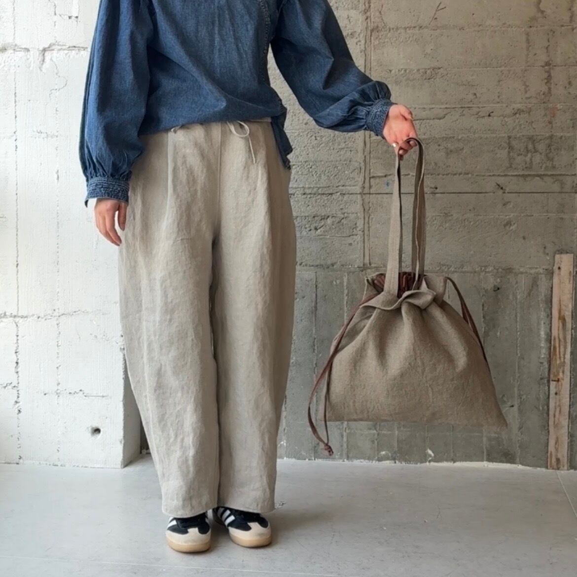 くったりリネンに、内側を巾着仕様にしたデザイン。