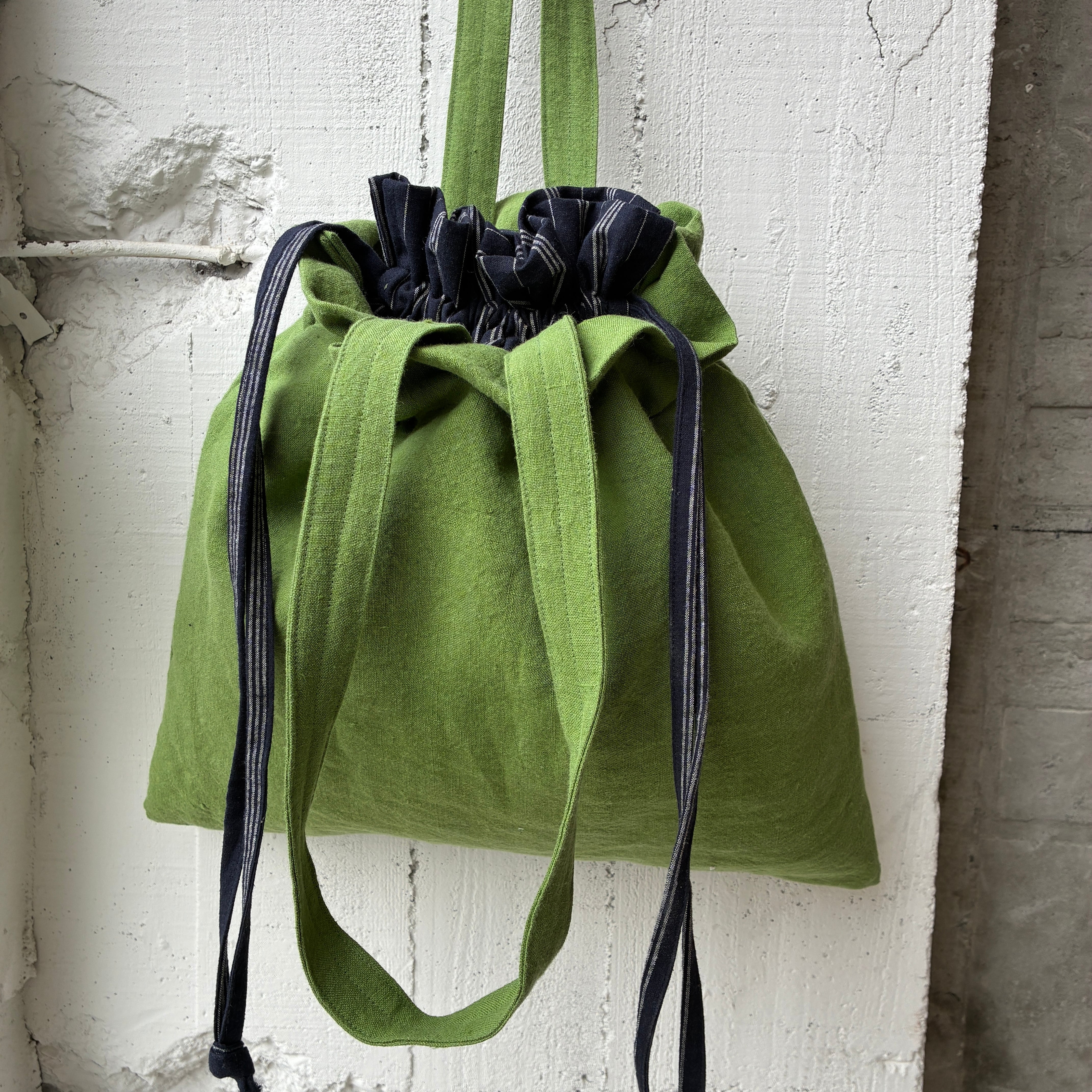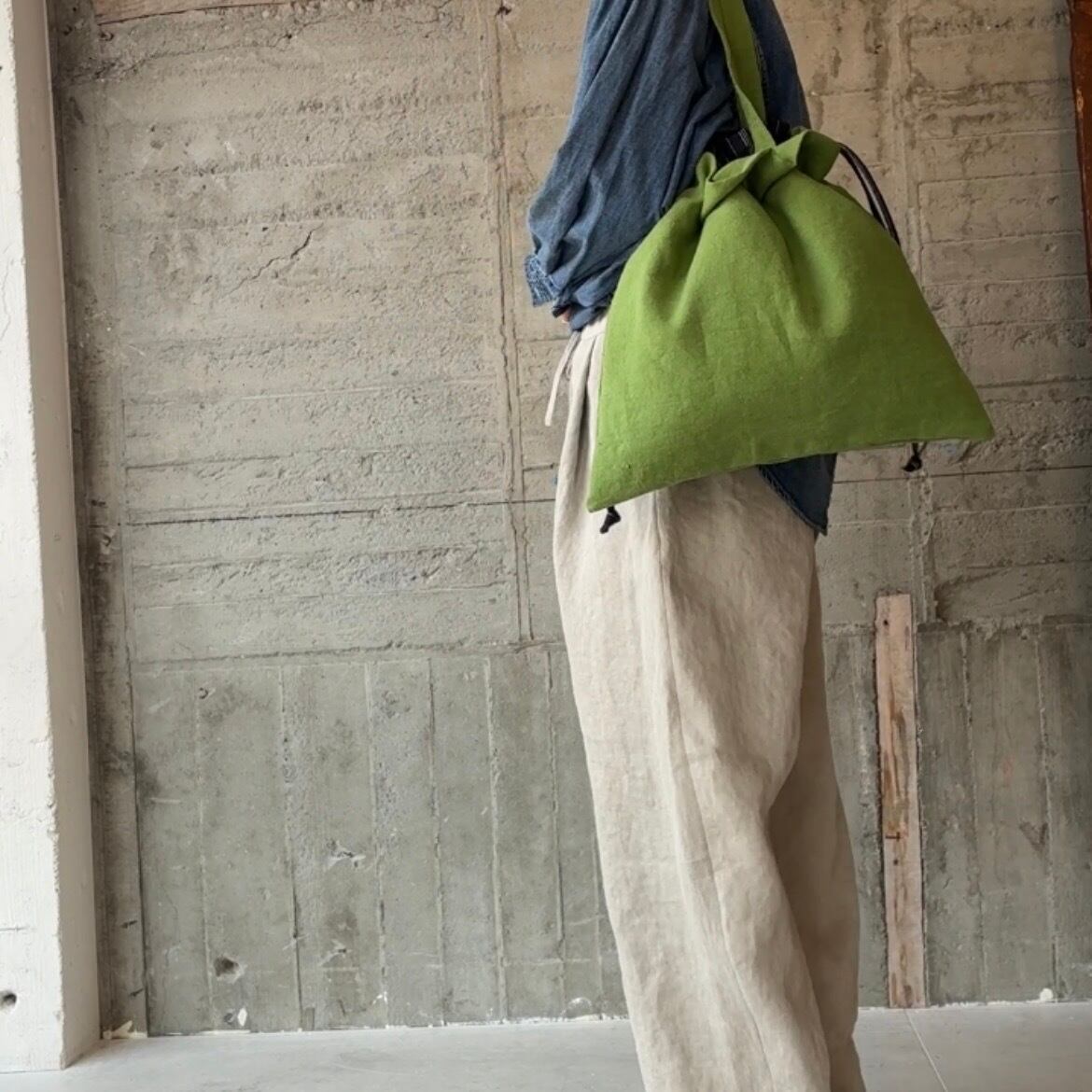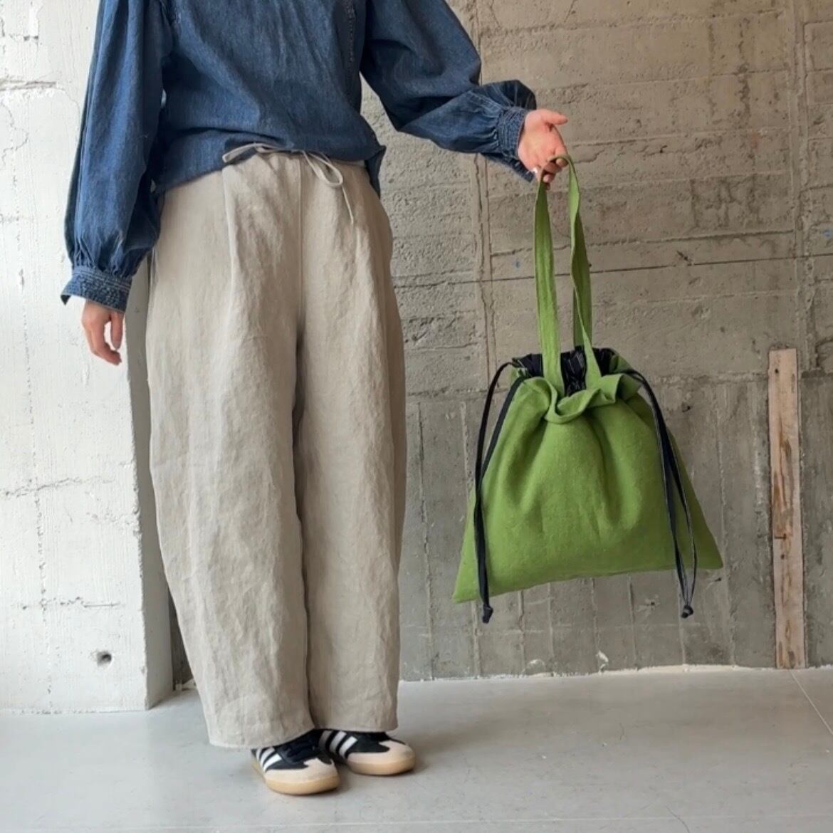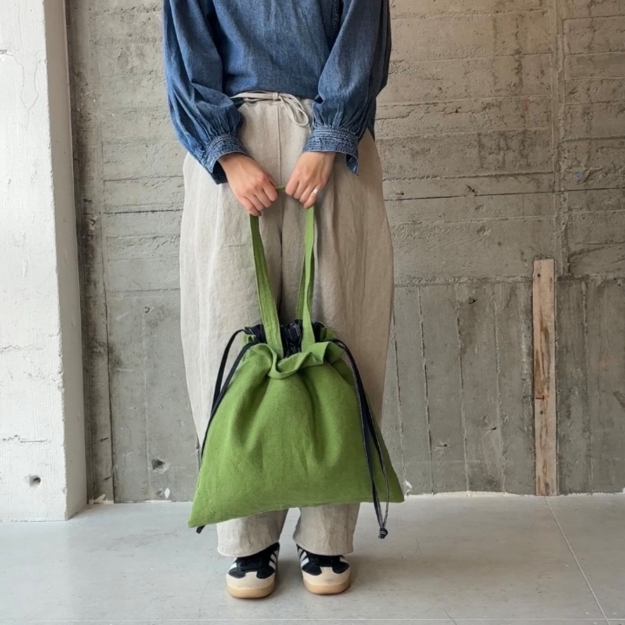 くったりリネンに、内側を巾着仕様にしたデザイン。