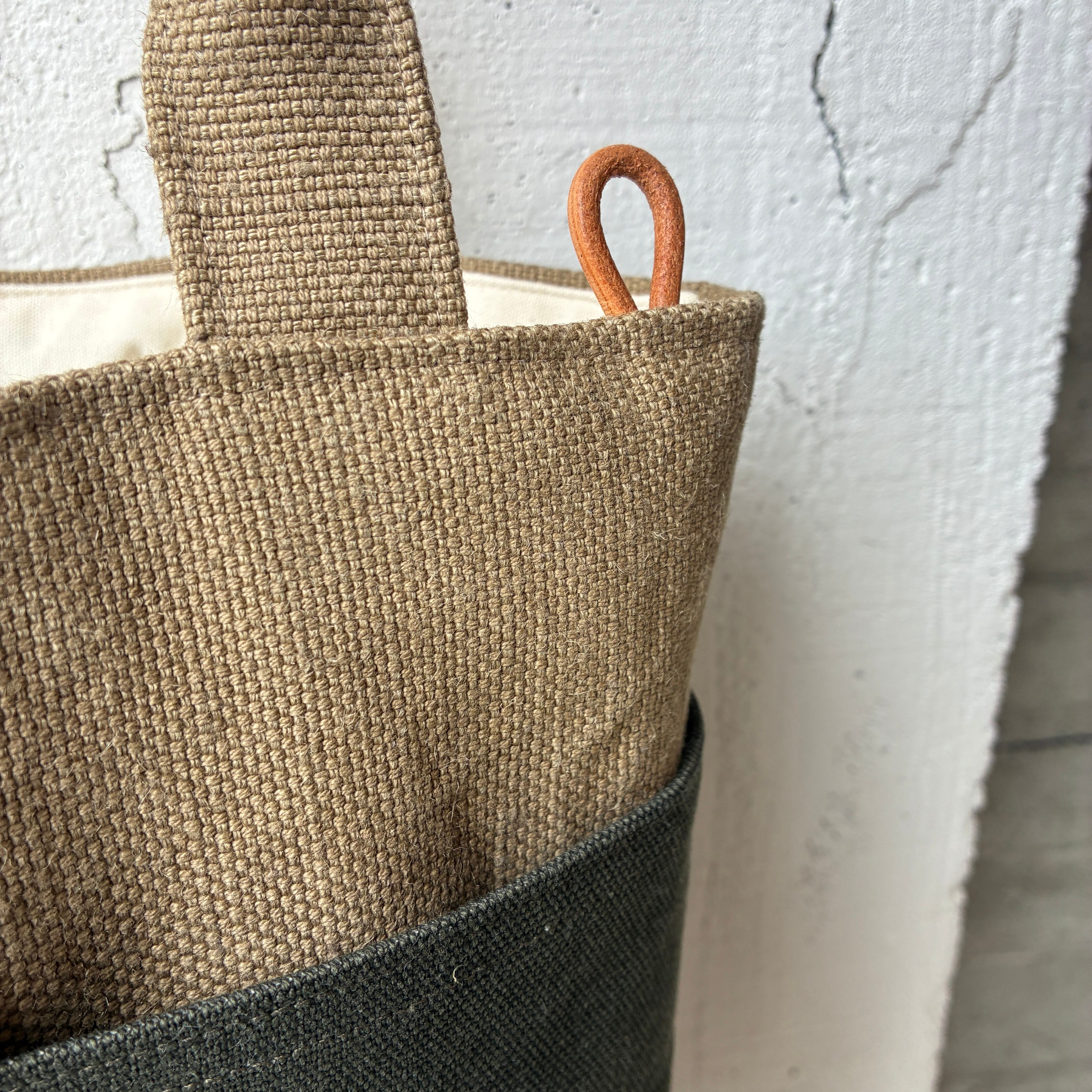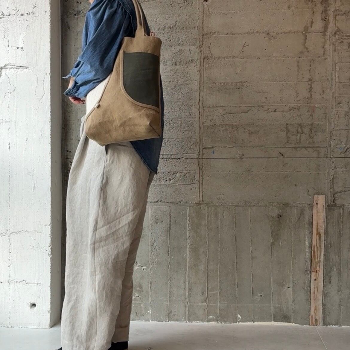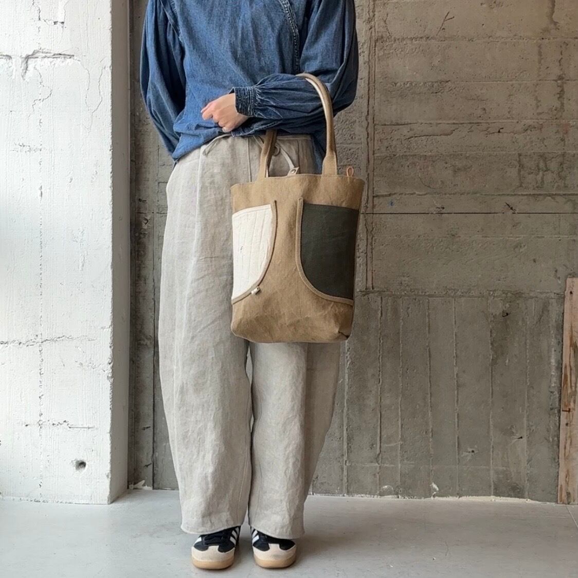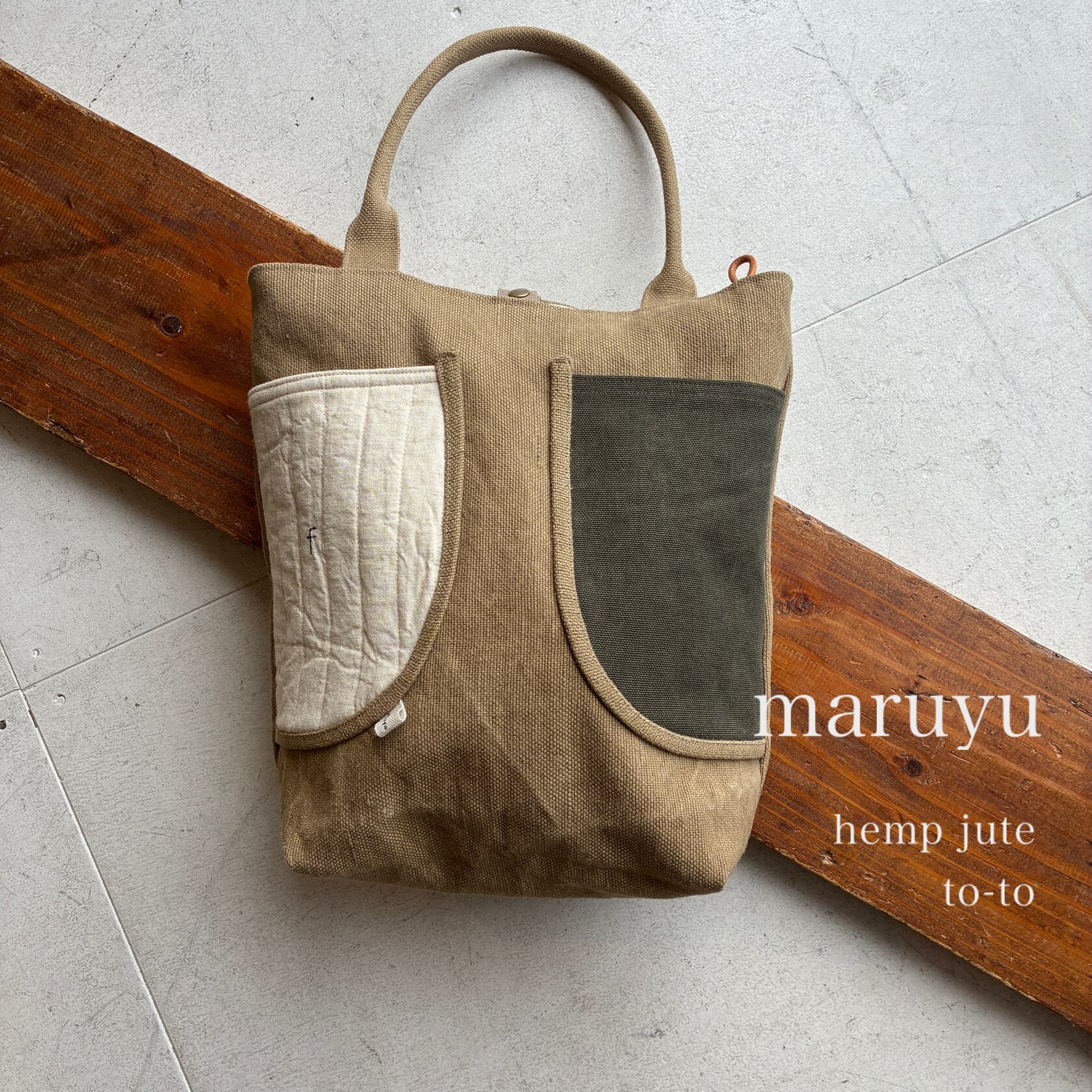 ジュートのしっかりとした質感をベースに、リネンのやわらかさを重ねたmaruyuで人気のポケット付きトート。