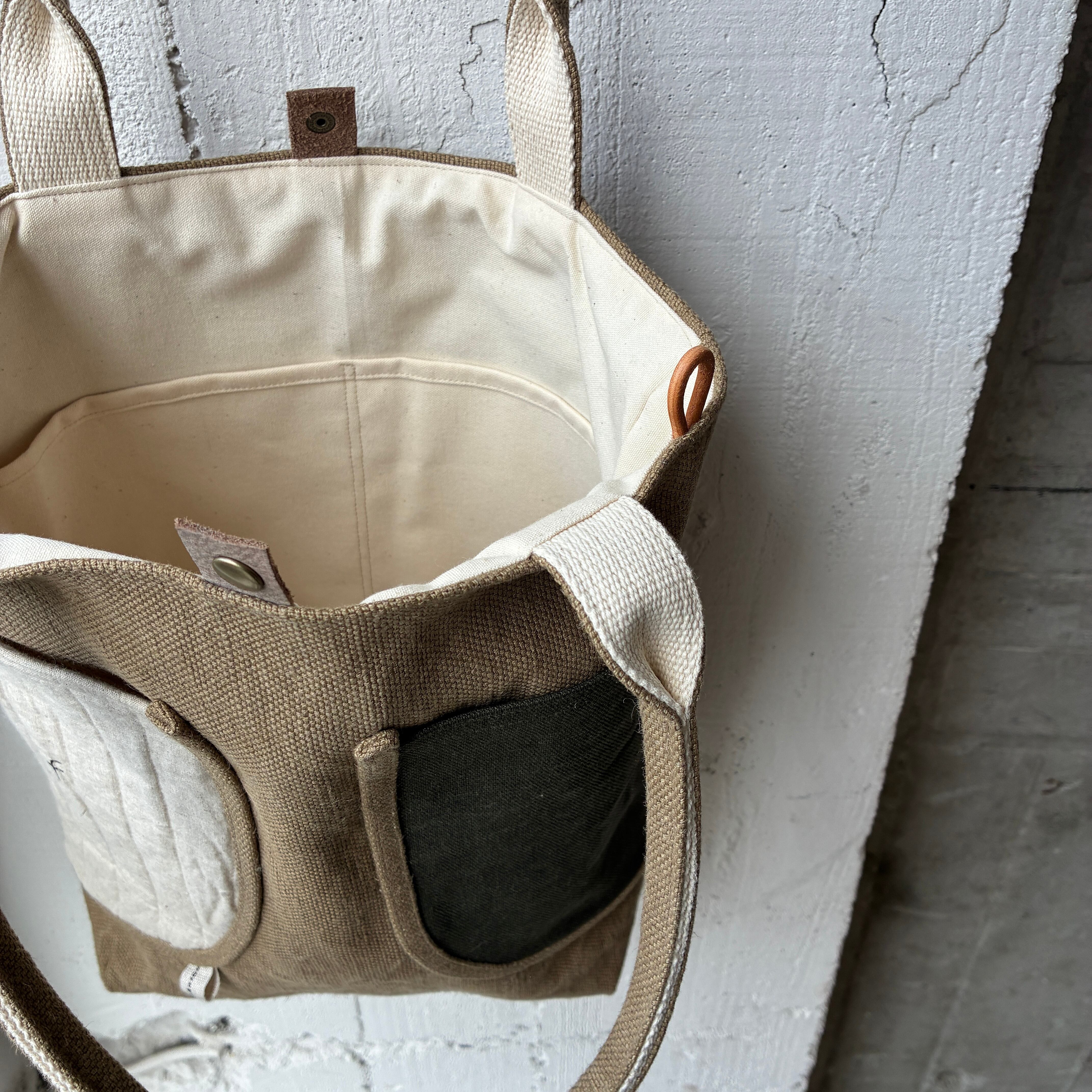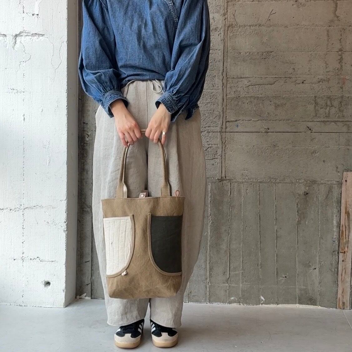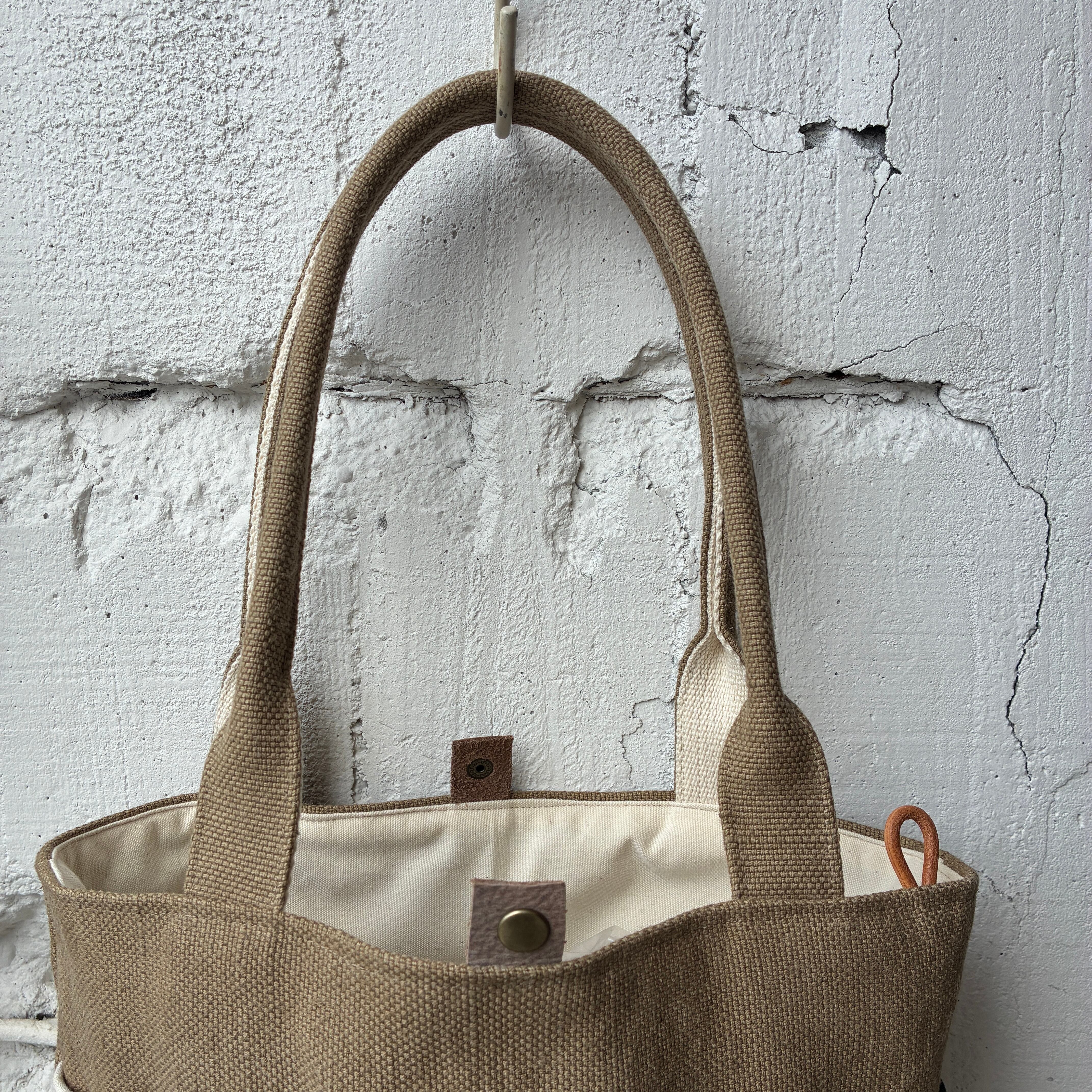 ジュートのしっかりとした質感をベースに、リネンのやわらかさを重ねたmaruyuで人気のポケット付きトート。