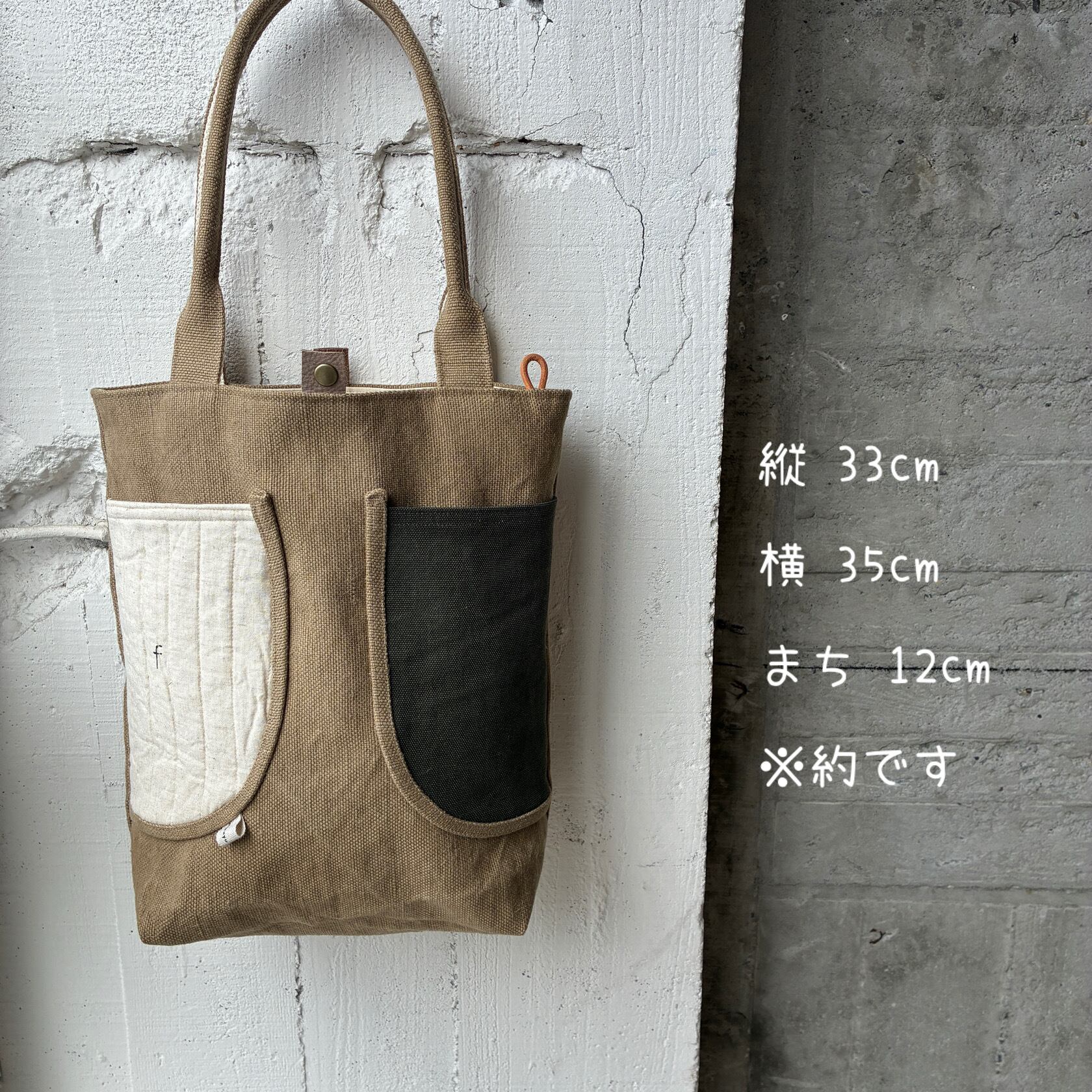 土台には程よいハリとコシのあるジュート素材を使用し、型崩れしにくく、きちんと自立するつくりに。そこにリネンやキルトのポケットを組み合わせることで、異なる素材の表情が楽しめるデザインに仕上げました。