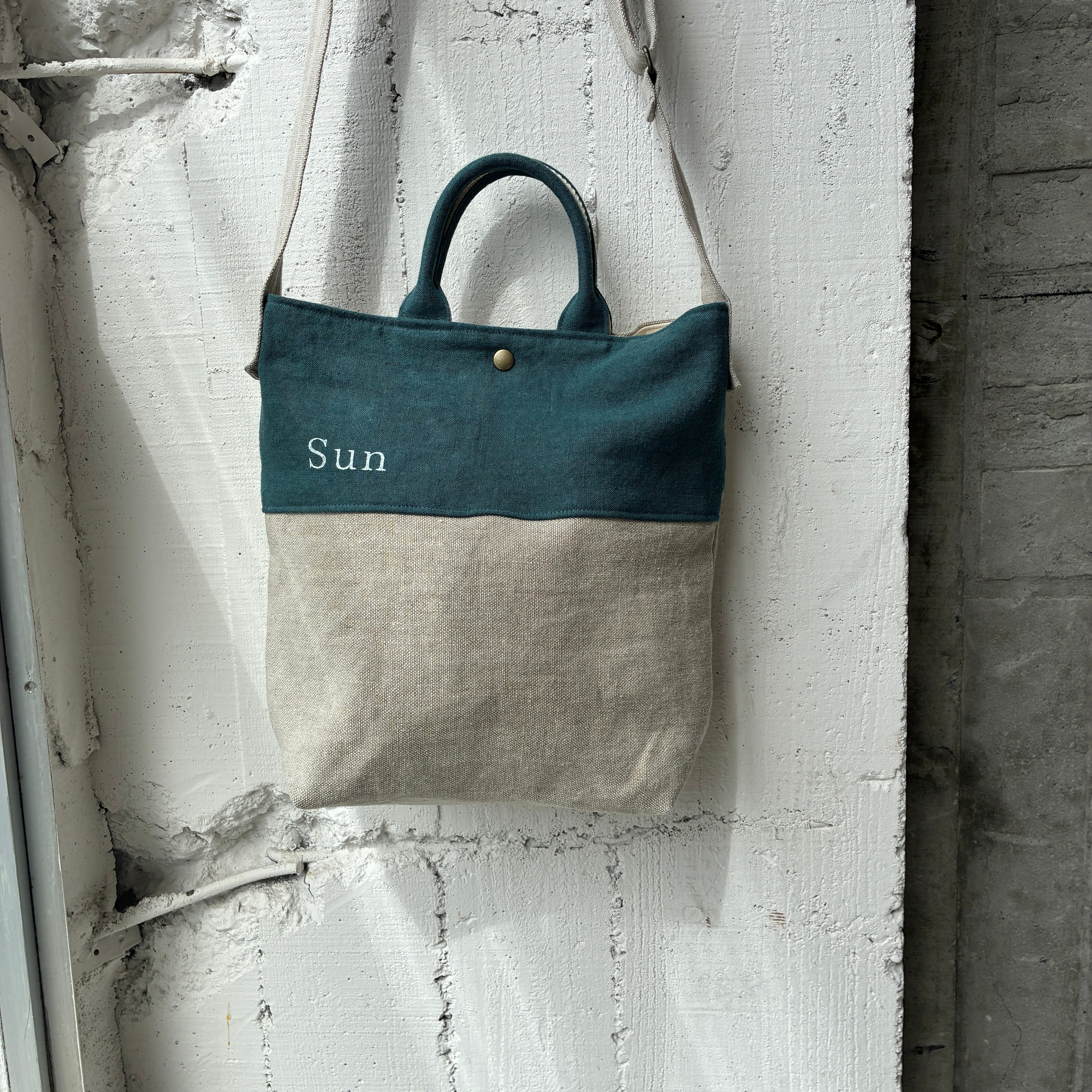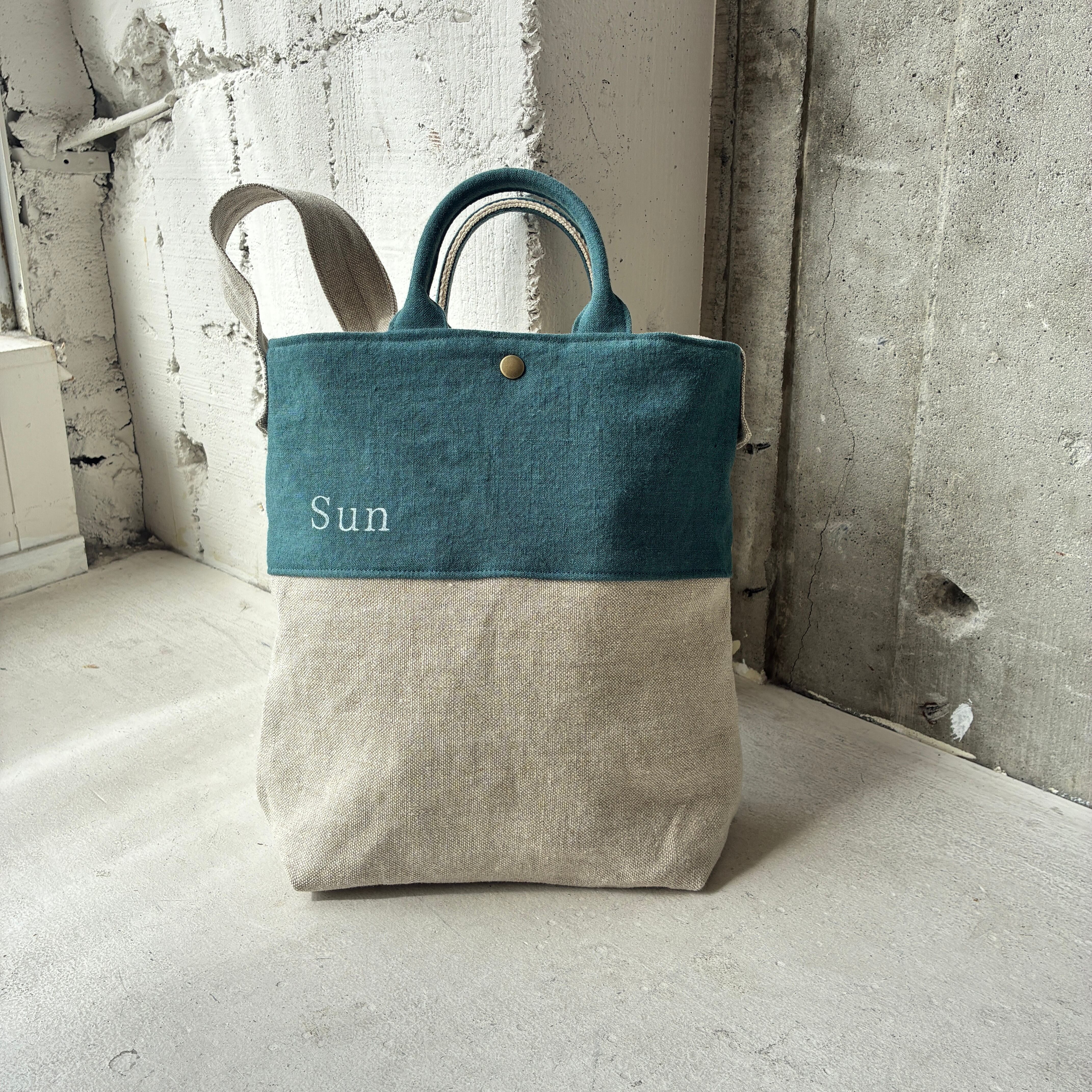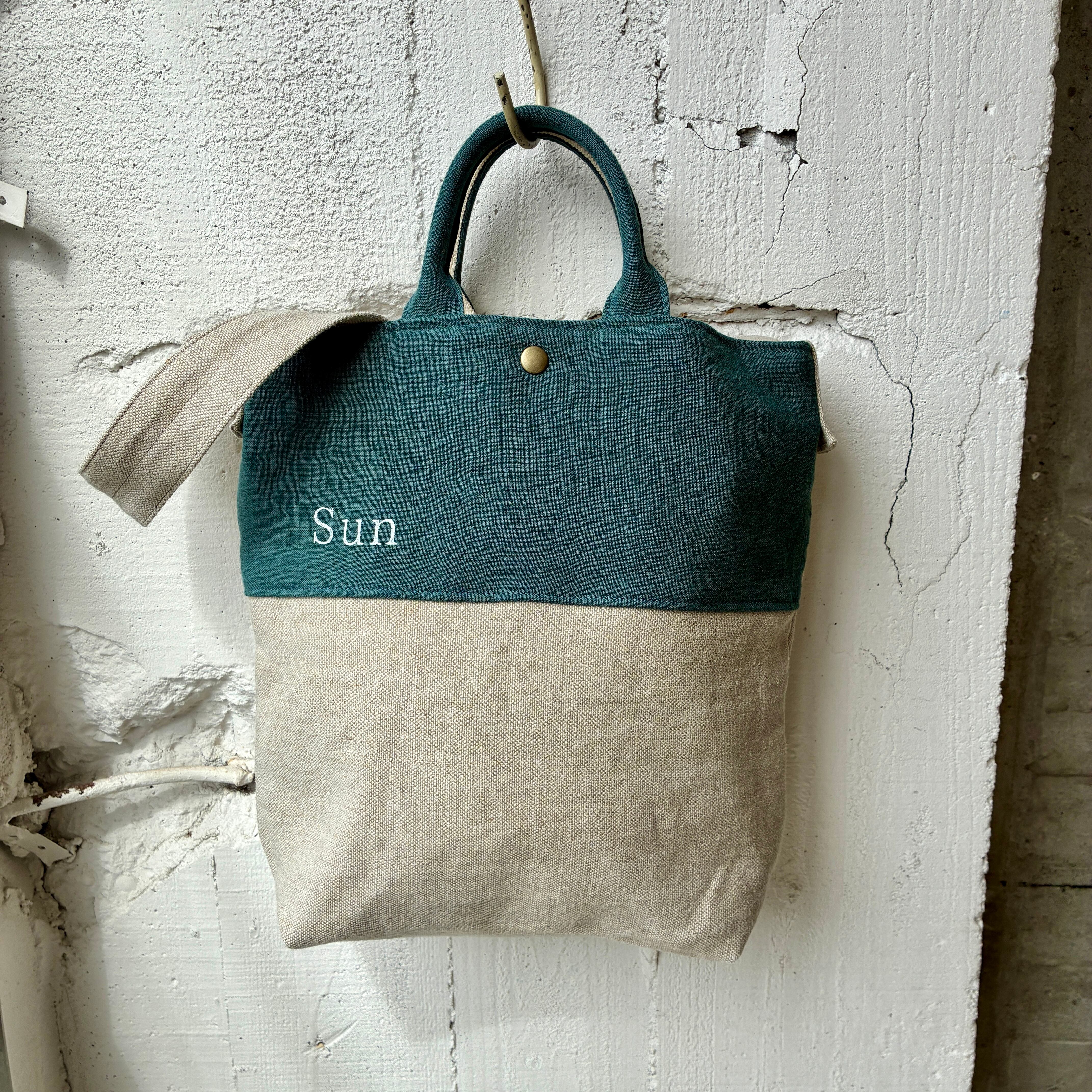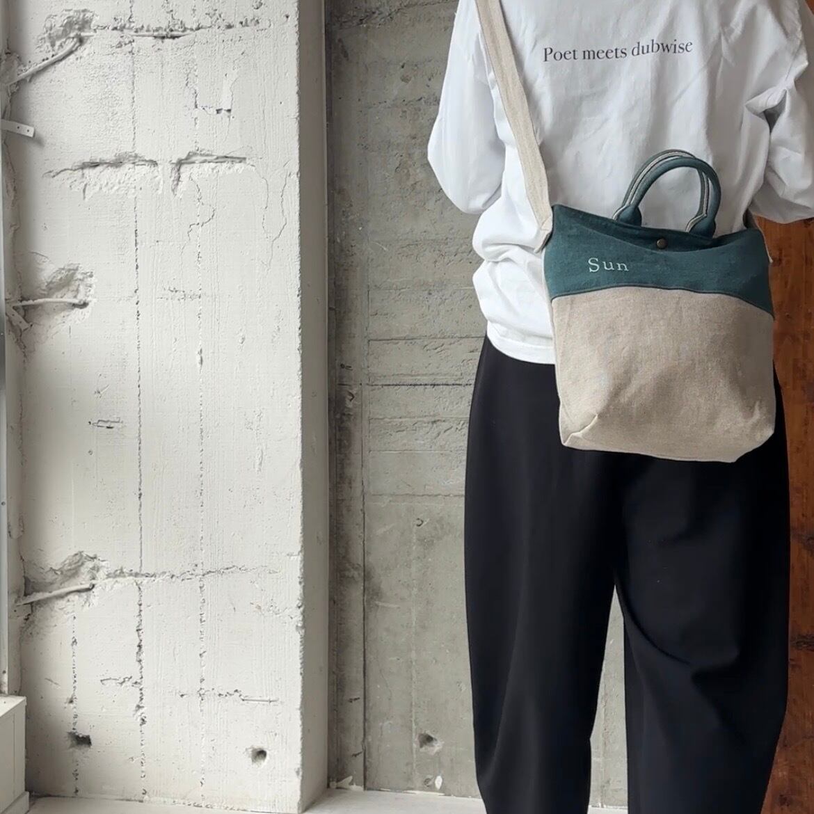 異なるlinen素材の組み合わせが楽しめる、切り替えデザインのショルダーバック